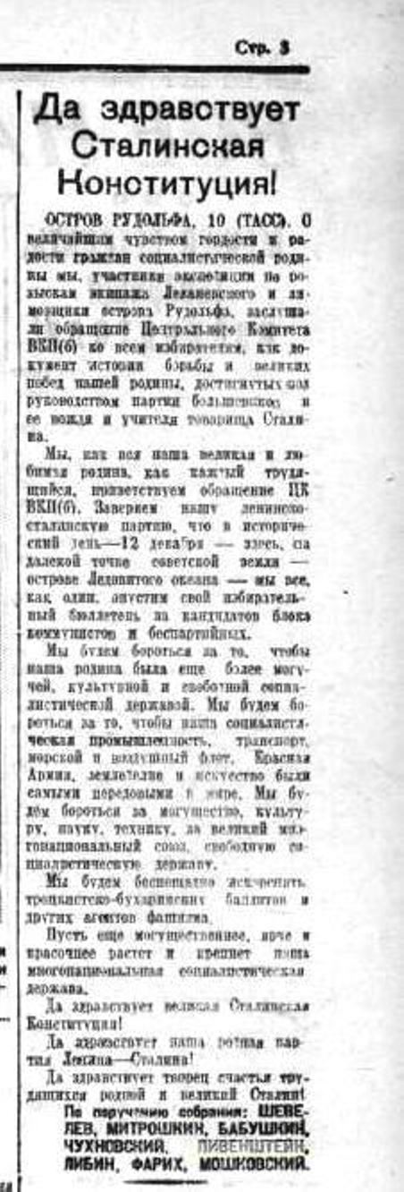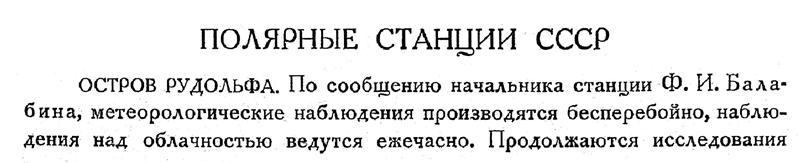 ОСТРОВ РУДОЛЬФА. По сообщению начальника станции Ф. И. Балабина, метеорологические наблюдения производятся бесперебойно, наблюдения над облачностью ведутся ежечасно. Продолжаются исследования и съемка ближайших к бухте Теплиц ледников. Идет подготовка санной экспедиции на о-в Гофмана, где предположено устроить продовольственное депо для партии сотрудников станции в бухте Тихой.
