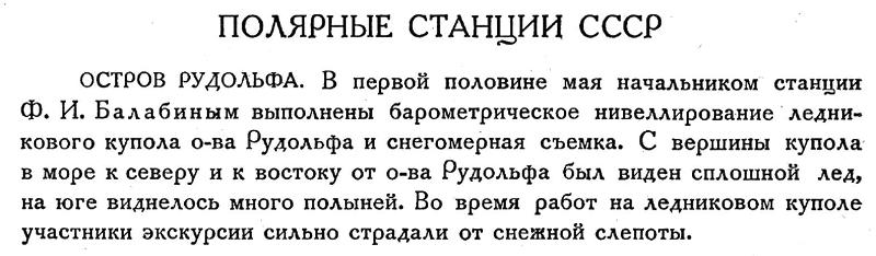 ОСТРОВ РУДОЛЬФА. В первой половине мая начальником станции Ф. И. Балабиным выполнены барометрическое нивелирование ледникового купола о-ва Рудольфа и снегомерная съемка. С вершины купола в море к северу и к востоку от о-ва Рудольфа был виден сплошной лед, на юге виднелось много полыней. Во время работ на ледниковом куполе участники экскурсии сильно страдали от снежной слепоты.