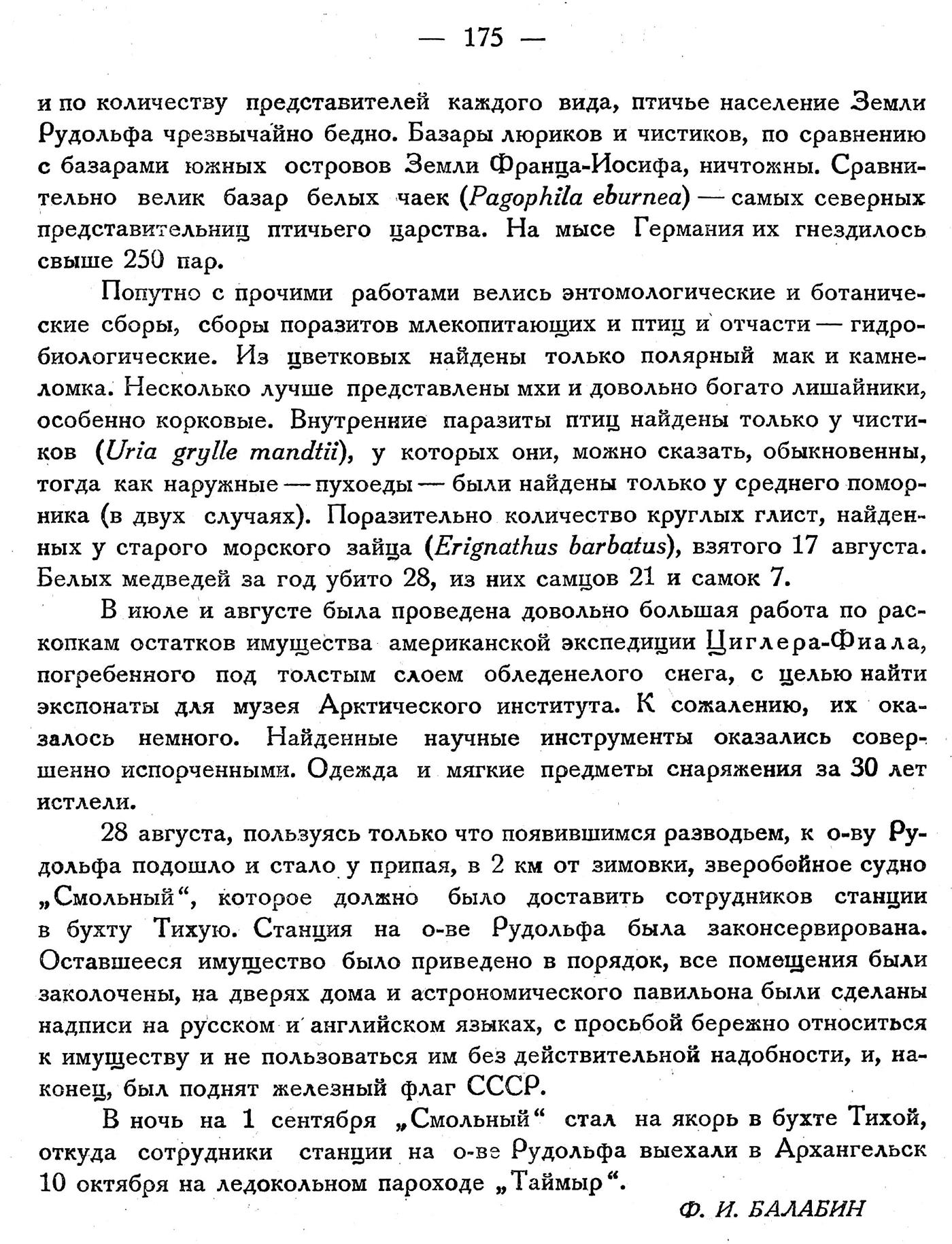 СТАНЦИЯ НА О-ВЕ РУДОЛЬФА (ТЕПЛИЦ-БАЙ). Начальник станции на о-ве Рудольфа Ф. И. Балабин сообщает о возвращении из экскурсии, организованной им совместно с техническим сотрудником Соловьевым, с целью устройства вспомогательной базы для экскурсий, предпринятых cо станции в бухте Тихой. Балабин доносит об успешном окончании экскурсии: устроен склад на 100 кг продовольствия на о-ве Райнера, попутно обследован район между о-вом Бророк и о-вом Райнера, произведена маршрутная съемка, при чем открыты два не значащиеся на карте острова. На станции все здоровы.