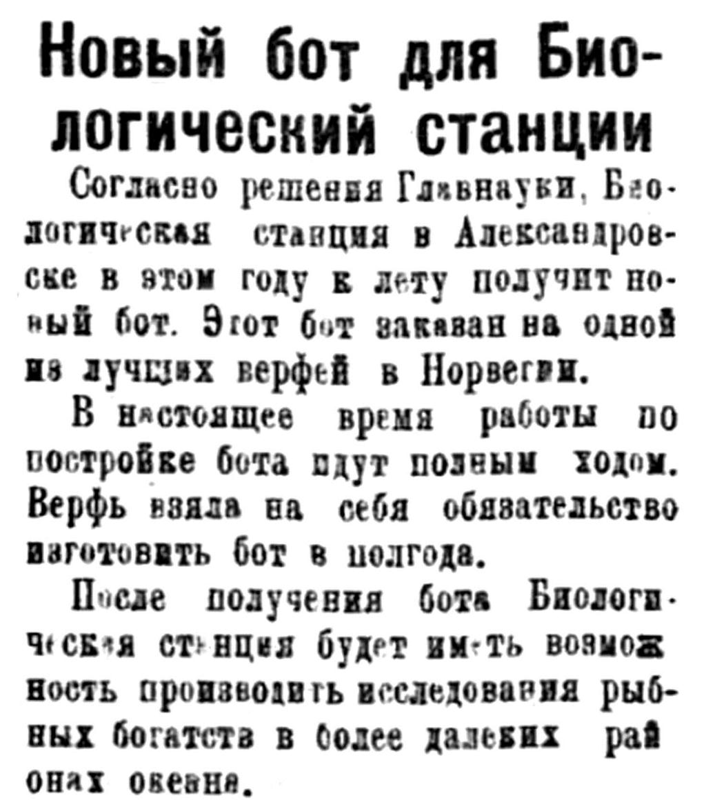 На новое моторно-парусное судно заказанное по специальным чертежам в Норвегии, на приемку которого сейчас уехал заведывающий станцией профессор Клюге, Главнаука отпустила 50 000 рублей. С получением нового судна, предоставится возможность совершать регулярный рейс по ЗЗ и 38 меридиану до 75—76 градуса, до кромки льдов.