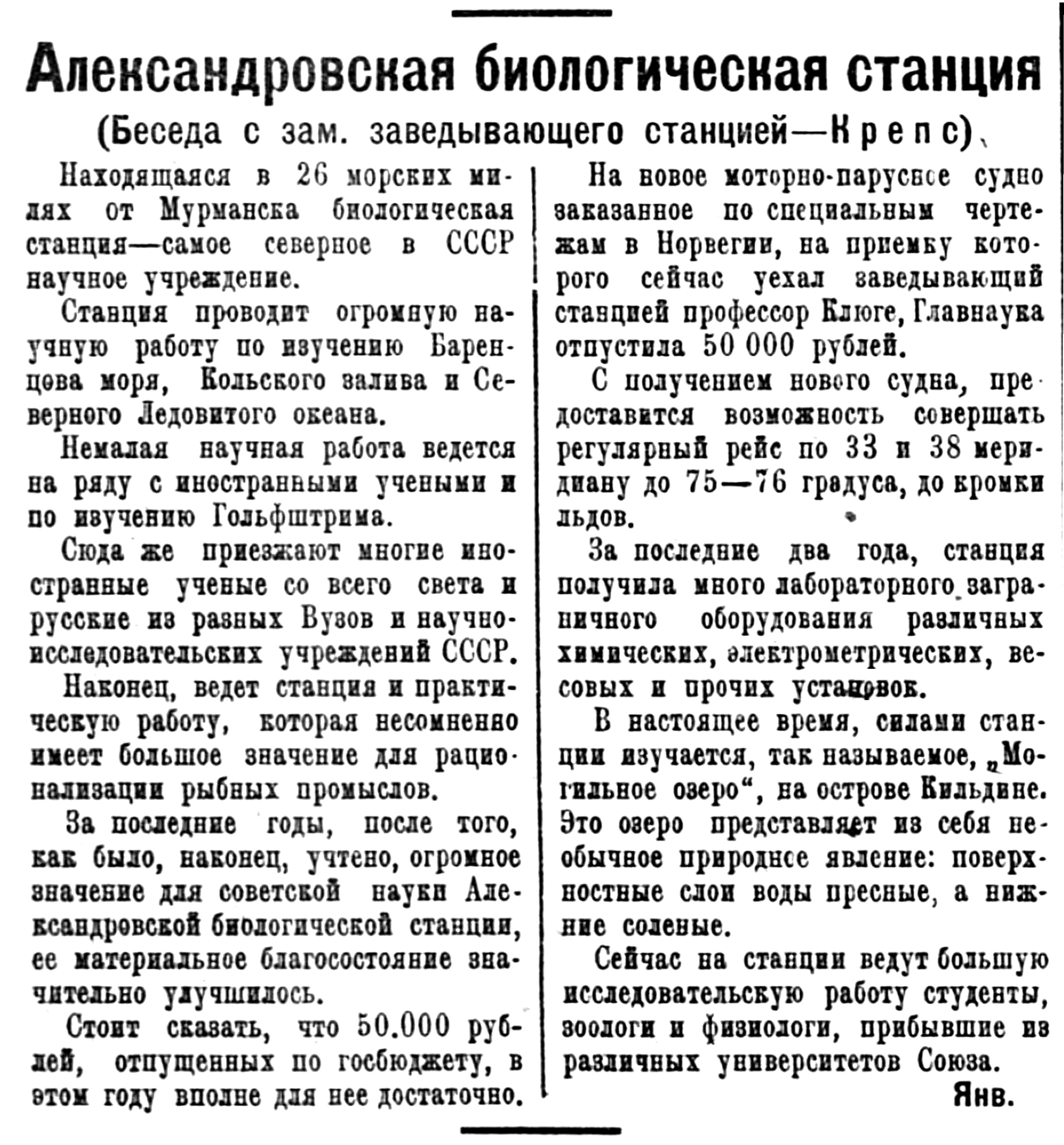 Вчера с рейсовым п/х Совторгфлота «Сосновец» выехал в Вардэ директор Мурманской биологической станции, профессор Герман А. Клюгге, который командируется в Упсангер (около Бергена) для приемки специально выстроенного в Норвегии по заказу Биостанции исследовательского судна "Николай Книпович".