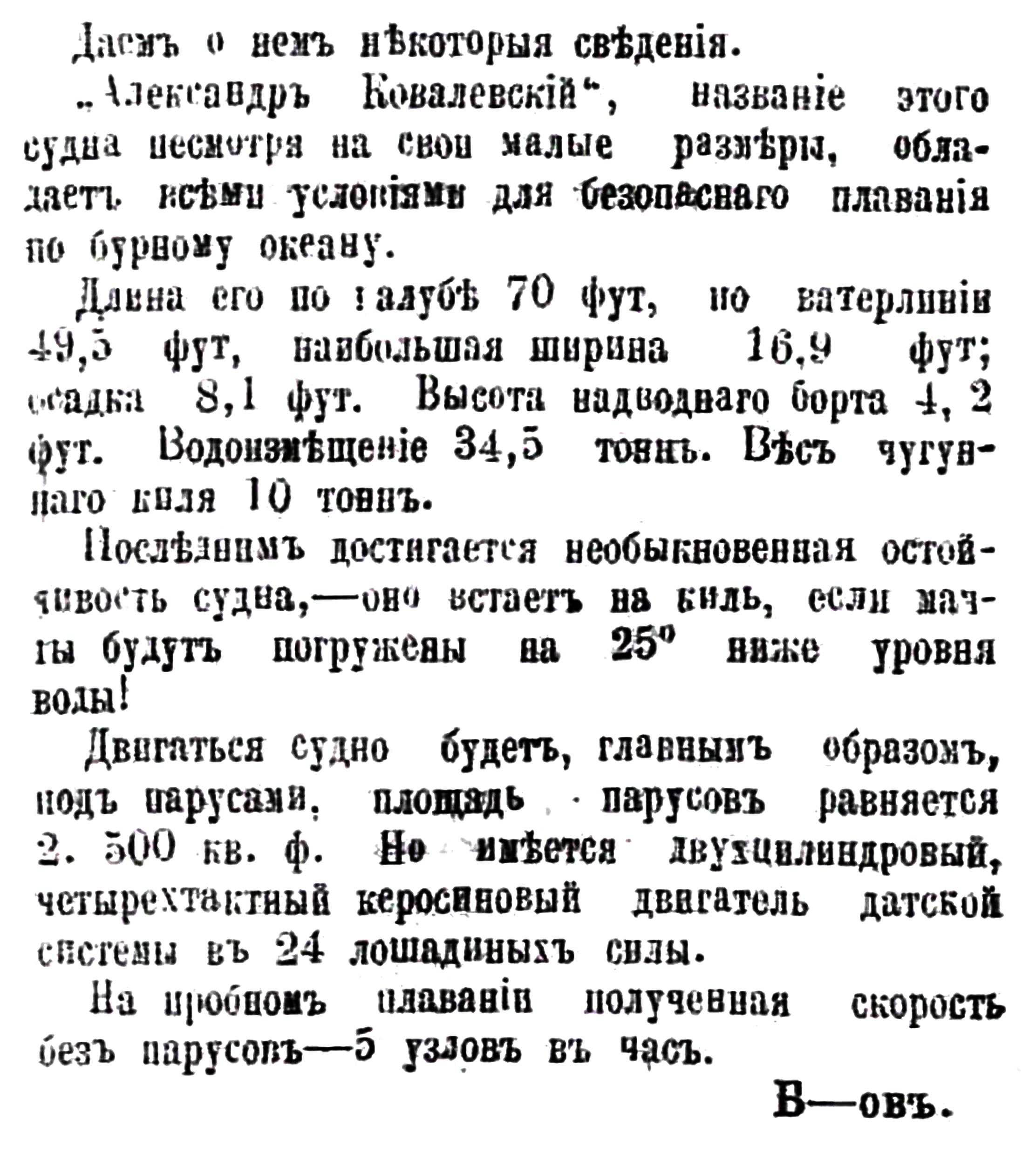 "Александръ Ковалевскій", названіе этого судна несмотря на свои малые размѣры, обладаетъ всѣми условіями для безопаснаго плаванія по бурному океану.