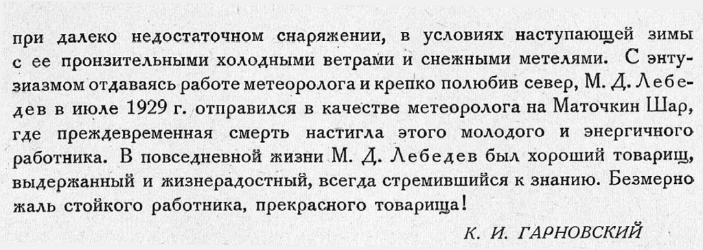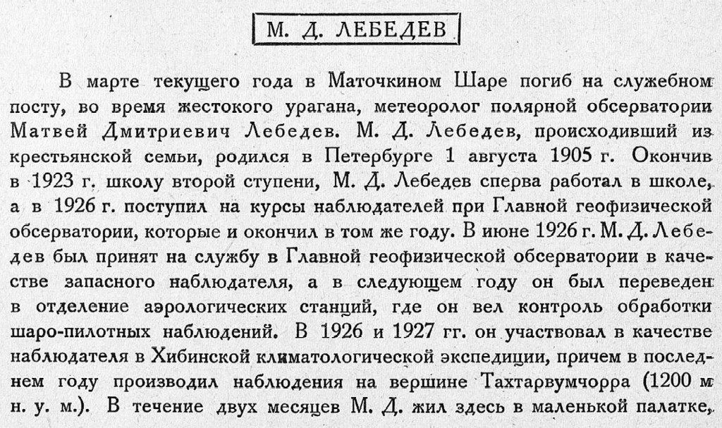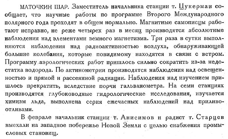 Живо вспоминаешь 1923 год — год постройки радиостанции в Маточкином Шаре. Вначале нужно было выбрать место, удобное для выгрузки и устройства самой станции, так как высокие горы сильно мешают работе радио и сокращают круг ее действия. Переходим с места на место, заходим в залив Канкрина на Карской стороне. В результате остановились на долине ручья Ночуева. Сразу по судам отдается сигнал — начать выгрузку (на постройке участвовало три судна — „Малыгин“, „Мурман“ и „Купава“). Работа моментально закипела. С судов начали выгружать бревна, кирпич, цемент. На берегу раскинулось несколько палаток, а к месту постройки домов быстро поднялась вагонеточная железная дорога. Все рьяно приступили к работе. Нужно было в минимальный срок выполнить максимальное задание. Погода благоприятствовала — льдов совершенно не было и только сильные ветры иногда мешали выгрузке. Работали с раннего утра до самого позднего вечера с небольшими перерывами на обед и ужин. Мягкие горные породы (сланцы) затрудняли устройство прочного фундамента для мачт. Ни кирка, ни динамит не брали промерзшую почву. Строительный груз не успевали подымать к месту постройки. В подъеме главного маховика для мотора весом в 60 пуд. участвовал весь состав экспедиции — около 100 чел.