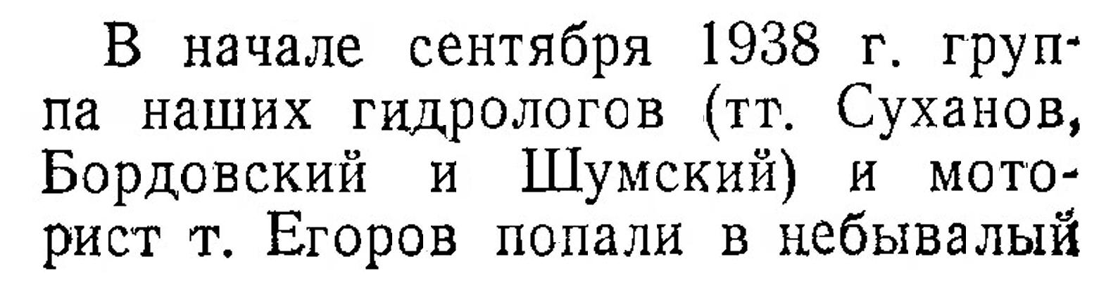 В начале сентября 1938 г. группа наших гидрологов (тт. Суханов, Бордовский и Шумский) и моторист т. Егоров попали в небывалый