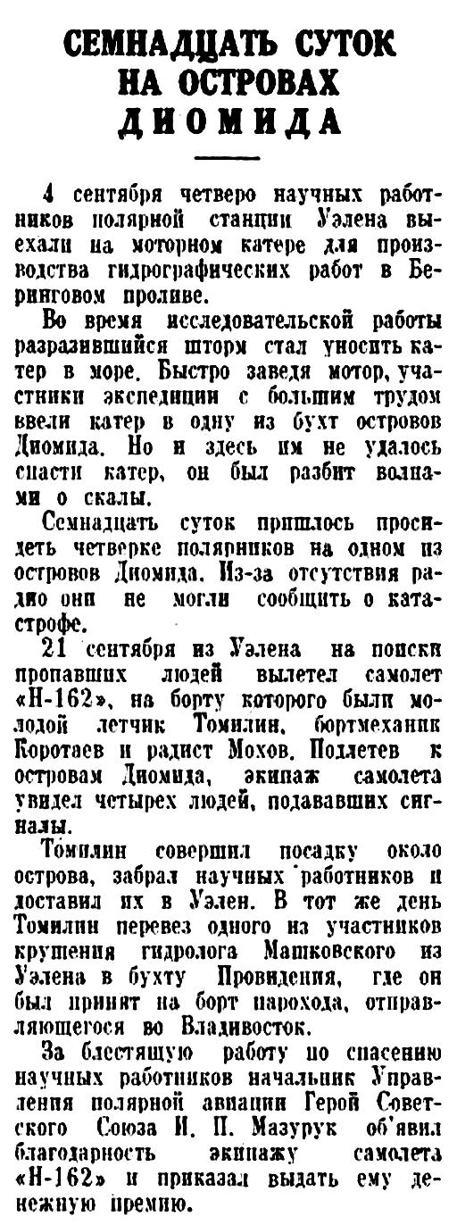 21 сентября из Уэлена на поиски пропавших людей вылетел самолет «Н-162», на борту которого были молодой летчик Томилин, бортмеханик Коротаев и радист Мохов. Подлетев к островам Диомида, экипаж самолета увидел четырех людей, подававших сигналы.