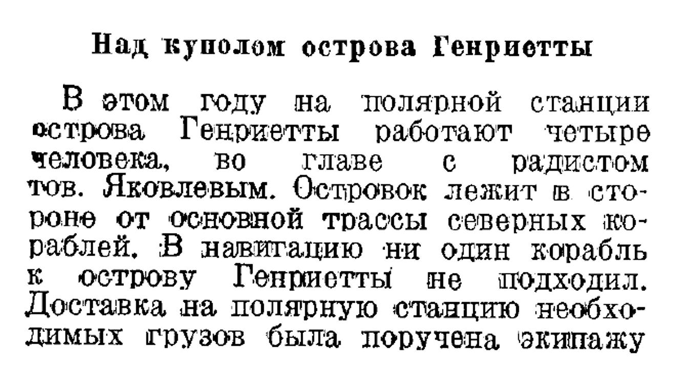 Остров Генриетты был открыт случайно во время дрейфа судна „Жаннетта" американской экспедиции Де Лонга. Этот корабль в начале сентября 1879 года вмерз в лед в Чукотском море, к северо-востоку от острова Геральд, и стал медленно дрейфовать в северо-западном направлении. На второй год дрейфа, 25 мая 1881 года, был усмотрен небольшой скалистый остров, получивший название Генриетты (в честь матери Гордона Беннетта — богатого американского издателя, финансировавшего экспедицию Де Лонга). В первых числах июня на остров была отправлена партия под начальством инженера-механика Мельвилля, который произвел частичную опись острова и сложил на нем каменный гурий, положив внутрь его цинковую банку и медную трубку с записками. С тех пор прошло 56 лет, и за это время небольшой остров, затерянный среди полярных льдов и обозначенный на карте в виде черной точки, не посещался ни разу. Остров был забыт. Теперь, когда в Советском Союзе все шире и шире развивается работа по изучению и освоению Арктики, исследователи обратили свое внимание и на этот клочок суши.