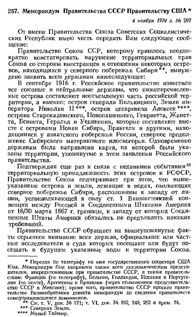 Правительство Союза ССР, которому пришлось неоднократно констатировать нарушение территориальных прав Союза со стороны иностранцев в отношении некоторых островов, находящихся у северного побережья Сибири **, вынуждено заявить всем державам нижеследующее: