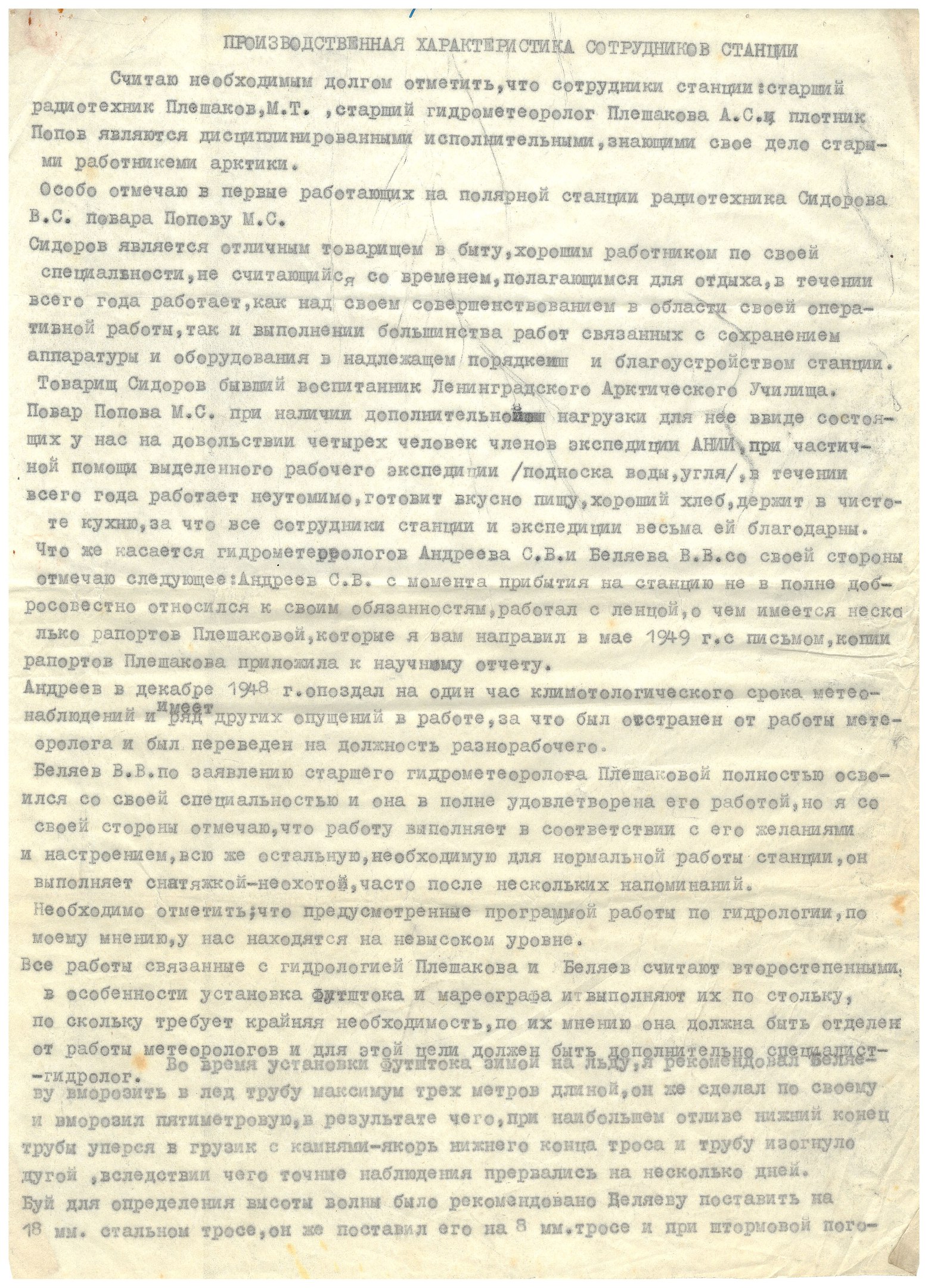 Считаю необходимым долгом отметить, что сотрудники станции: старший радиотехник Плешаков М. Т., старший гидрометеоролог Плешакова А.С. и плотник Попов являются дисциплинированными исполнительными, знающими свое деле старыми работниками арктики.