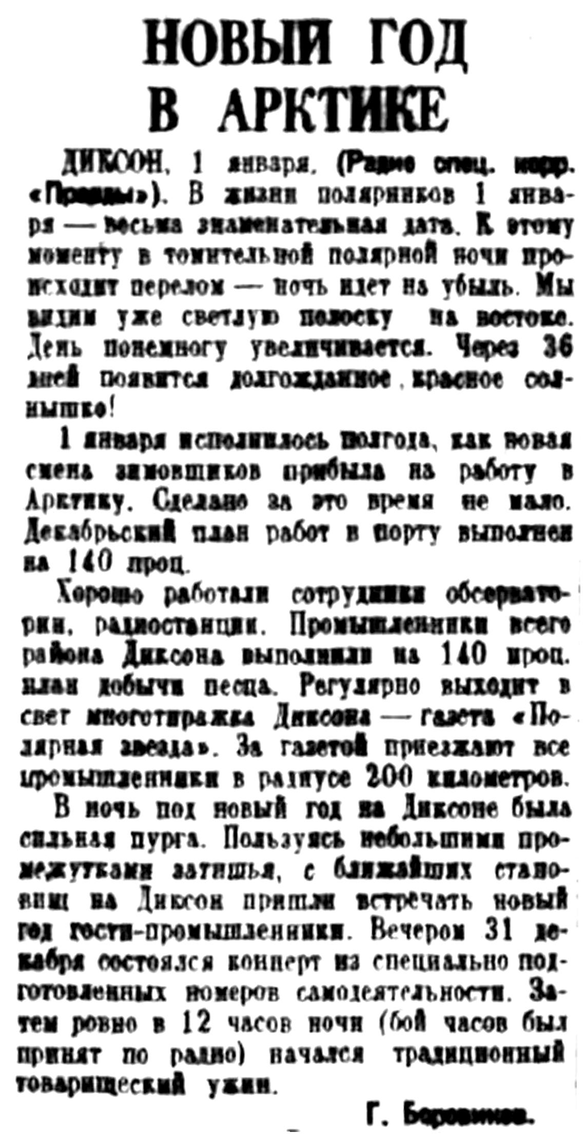 В ночь под новый год на Диксоне была сильная пурга. Пользуясь небольшими промежутками затишья, с ближайших становищ на Диксон пришли встречать новый год гости-промышленники. Вечером 31 декаря состоялся концерт из специально подготовленных номеров самодеятельности. Затем ровно в 12 часов ночи (бой часов был принят по радио) начался традиционный товарищеский ужин.