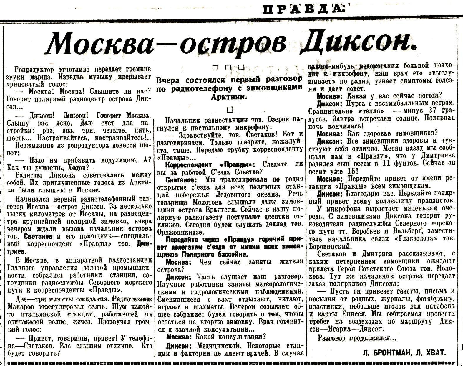 Бронтман Л.Хват Л.Москва-остров Диксон//Правда,1935,№ 31 (6277) 1 февраля
