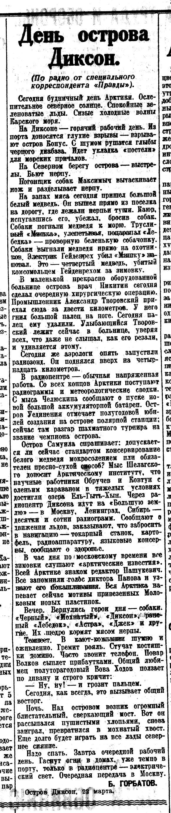 Горбатов Б.День острова Диксон//Правда,1935, № 82 (6328), 24 марта