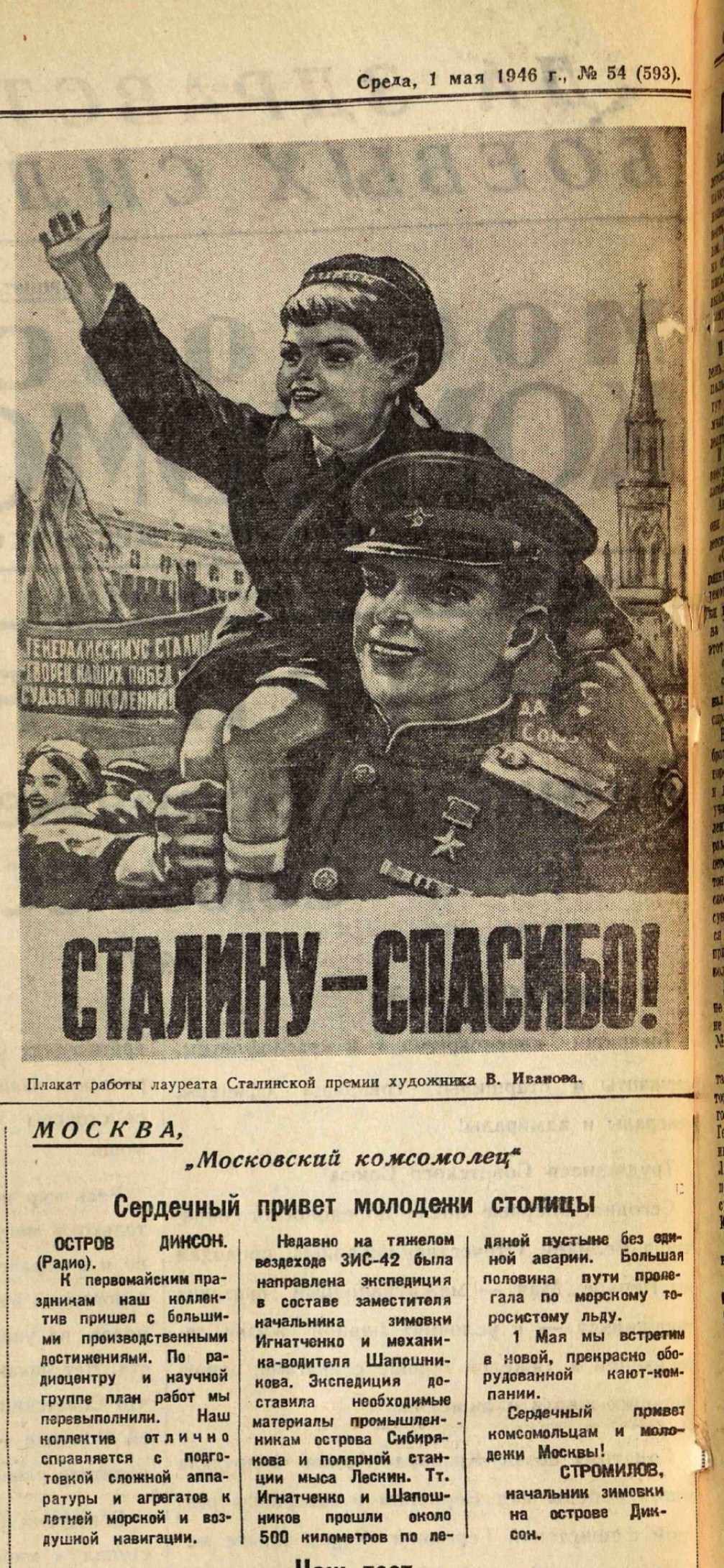 Сердечный привет молодёжи столицы//Московский комсомолец, 1 мая, 1946, № 54 (593)