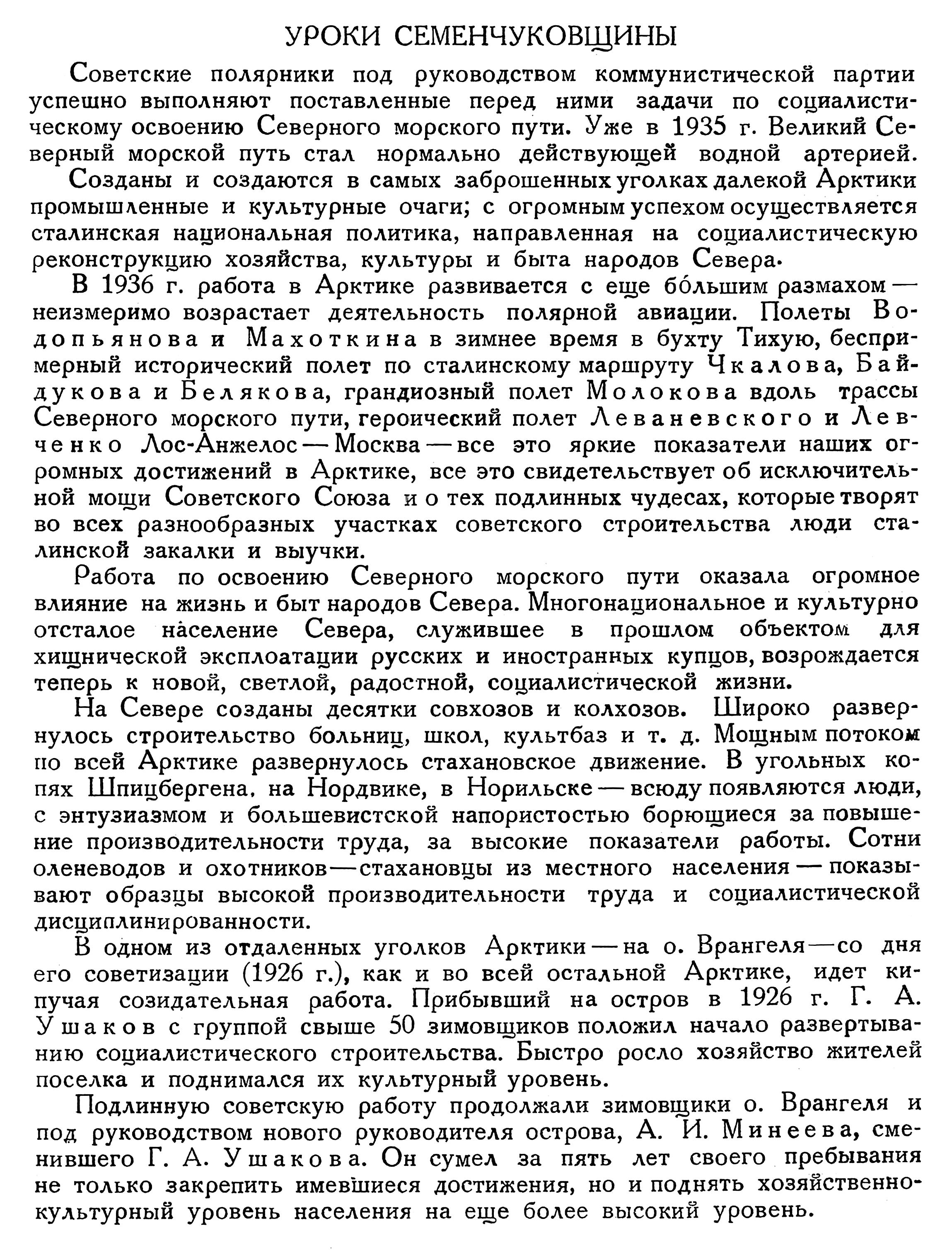 Созданы и создаются в самых заброшенных уголках далекой Арктики промышленные и культурные очаги; с огромным успехом осуществляется сталинская национальная политика, направленная на социалистическую реконструкцию хозяйства, культуры и быта народов Севера.