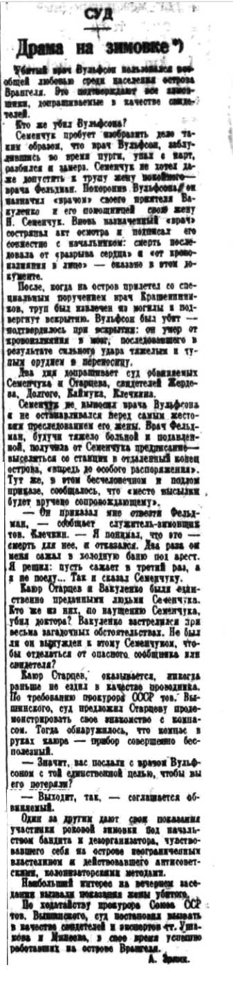 Значение процесса над Семенчуком выходит далеко за пределы кровавой драмы — убийства врача Вульфсона, — разыгравшейся 27 декабря 1934 г. на о. Врангеля.