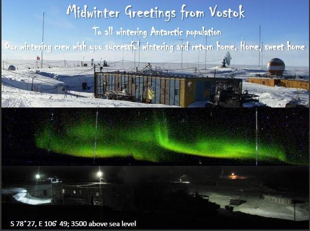 Привет от зимовщиков "Востока" 60 РАЭ. Отмечали 22 июня середину зимы. Все станции (в т.ч. иностранные)обменивались электронными открытками по интернету. Это наша.