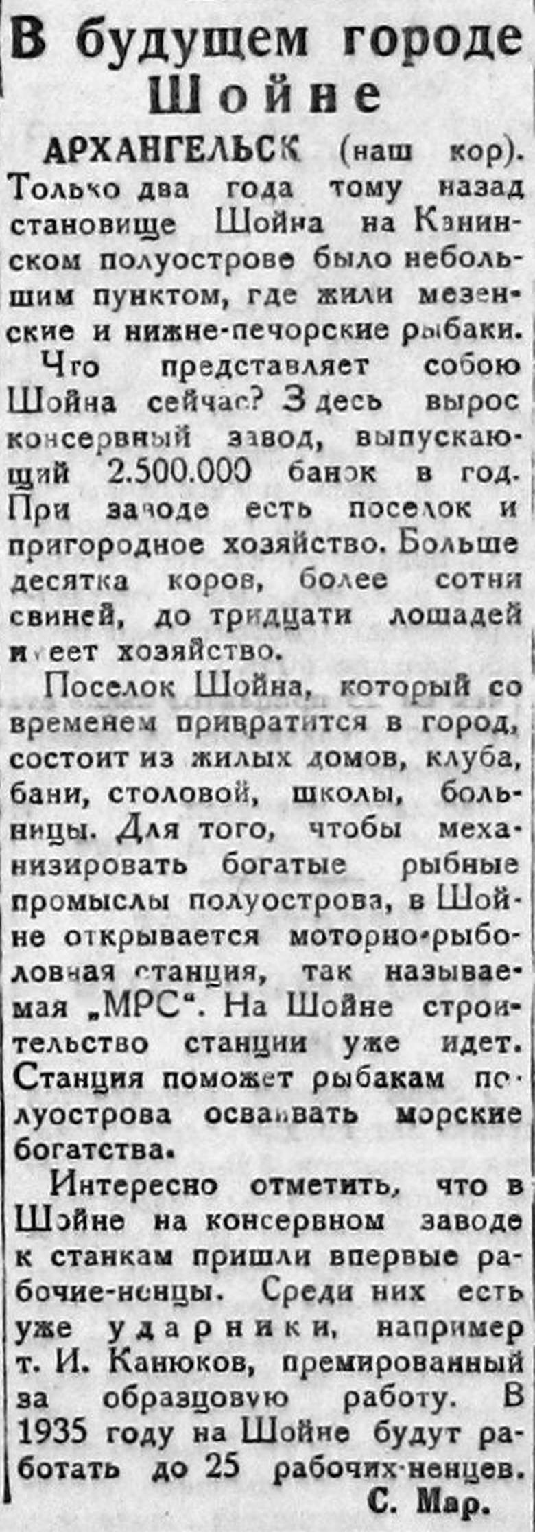 Интересно отметить, что в Шойне на консервном заводе к станкам пришли впервые рабочие-ненцы. Среди них есть уже ударники, например т. И. Канюков, премированный за образцовую работу. В 1935 году на Шойне будут работать до 25 рабочих-ненцев.