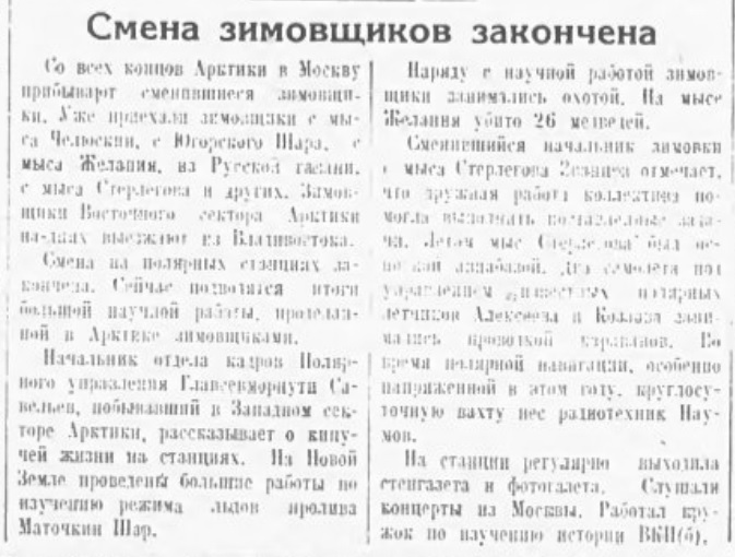 Около 50 полярных станций Главного управления Северного морского пути ведут деятельную подготовку к полярной ночи. В этом году произведена смена почти половины личного гостам полярных станций. Среди новых кадров более 50 человек — молодые полярники, впервые отправившиеся в Арктику. Большинство из них окончило курсы по подготовке полярников при Главсевморпути. Работники, пробывшие в Арктике два года, возвращаются на «Большую землю».
