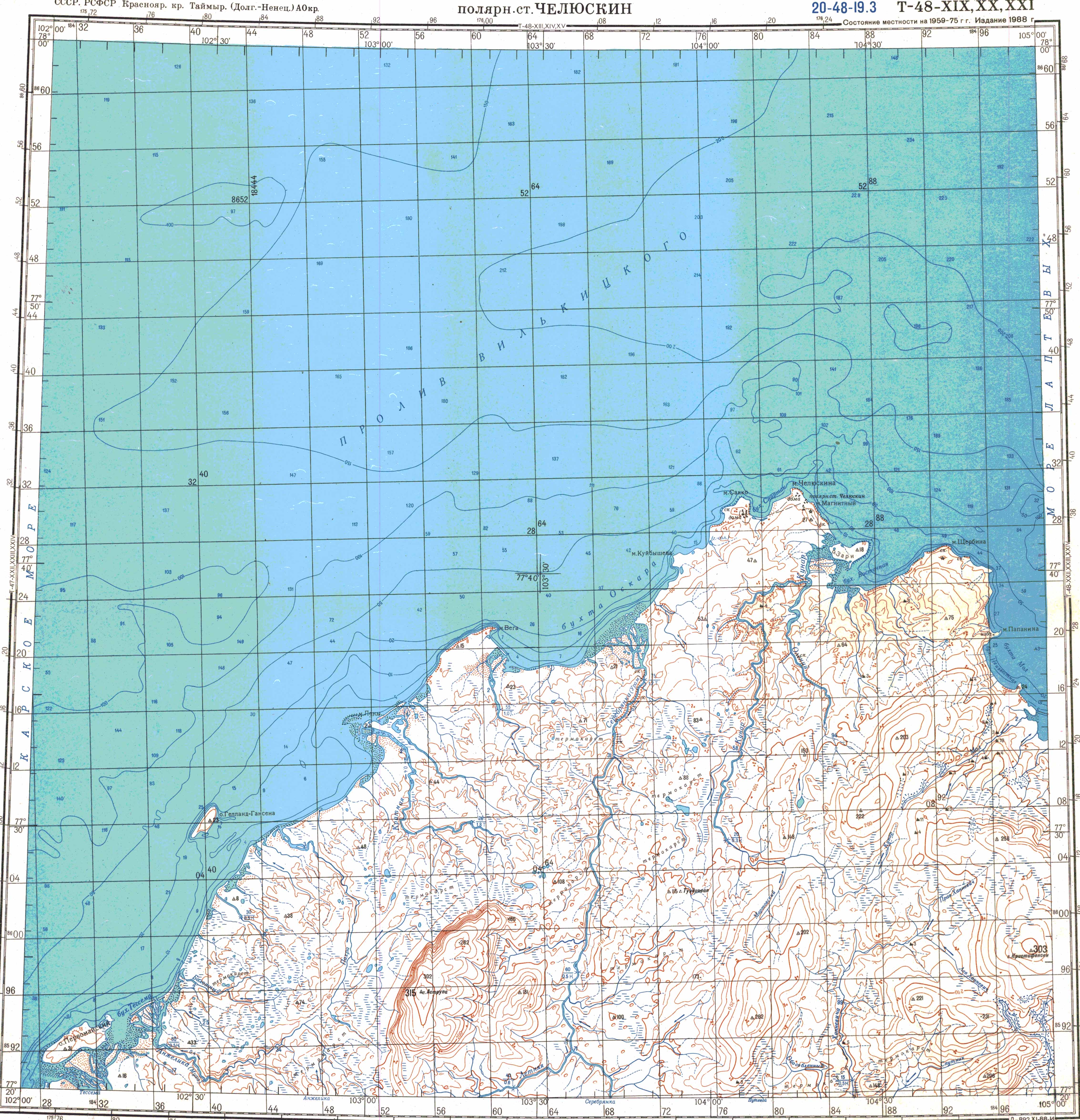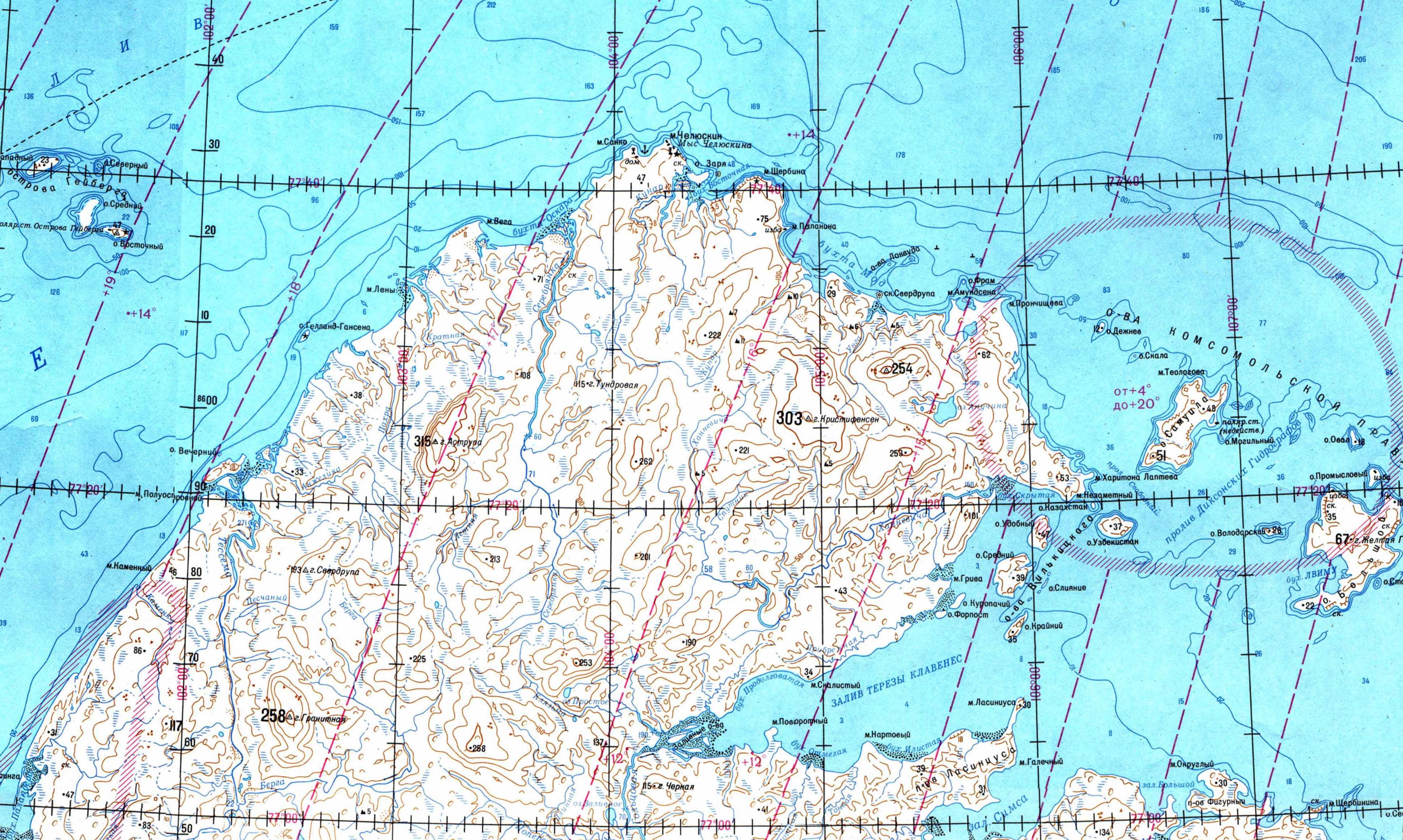 Географические координаты: Широта - 77. 43' северная, Долгота - 104. 18' восточная.