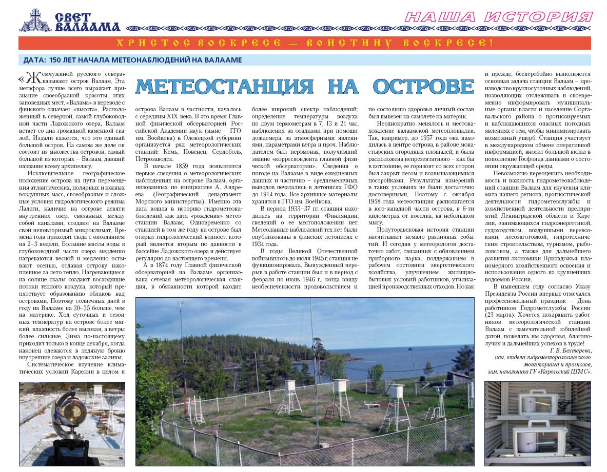 В нынешнем году согласно Указу Президента России впервые отмечался профессиональный праздник – День работников Гидрометслужбы России (23 марта). Хочется поздравить работников метеорологической станции Валаам с замечательной юбилейной датой, пожелать им здоровья, благополучия и дальнейших успехов в труде!