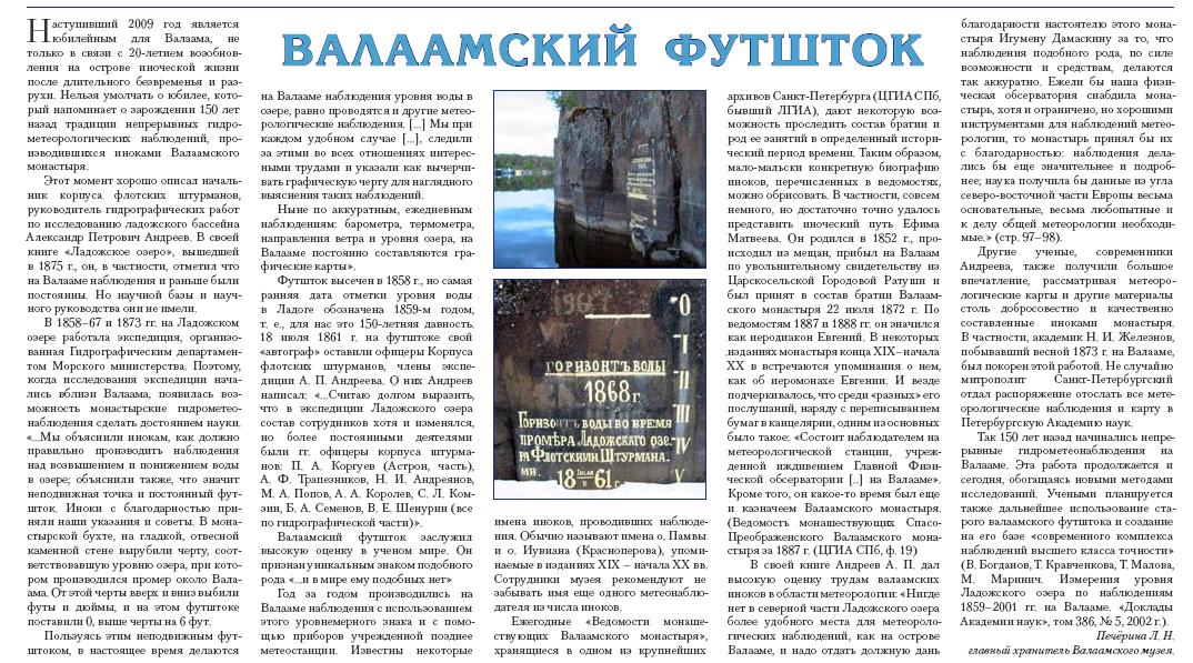А в 1874 году Главной физической обсерваторией на Валааме организована сетевая метеорологическая станция, в обязанности которой входит более широкий спектр наблюдений: определение температуры воздуха по двум термометрам в 7, 13 и 21 час, наблюдения за осадками при помощи дождемера, за атмосферными явлениями, параметрами ветра и проч. Наблюдателем был иеромонах, получивший звание «корреспондента главной физической обсерватории». Сведения о погоде на Валааме в виде ежедневных данных и частично – среднемесячных выводов печатались в летописях ГФО до 1914 года. Все архивные материалы хранятся в ГГО им. Воейкова.