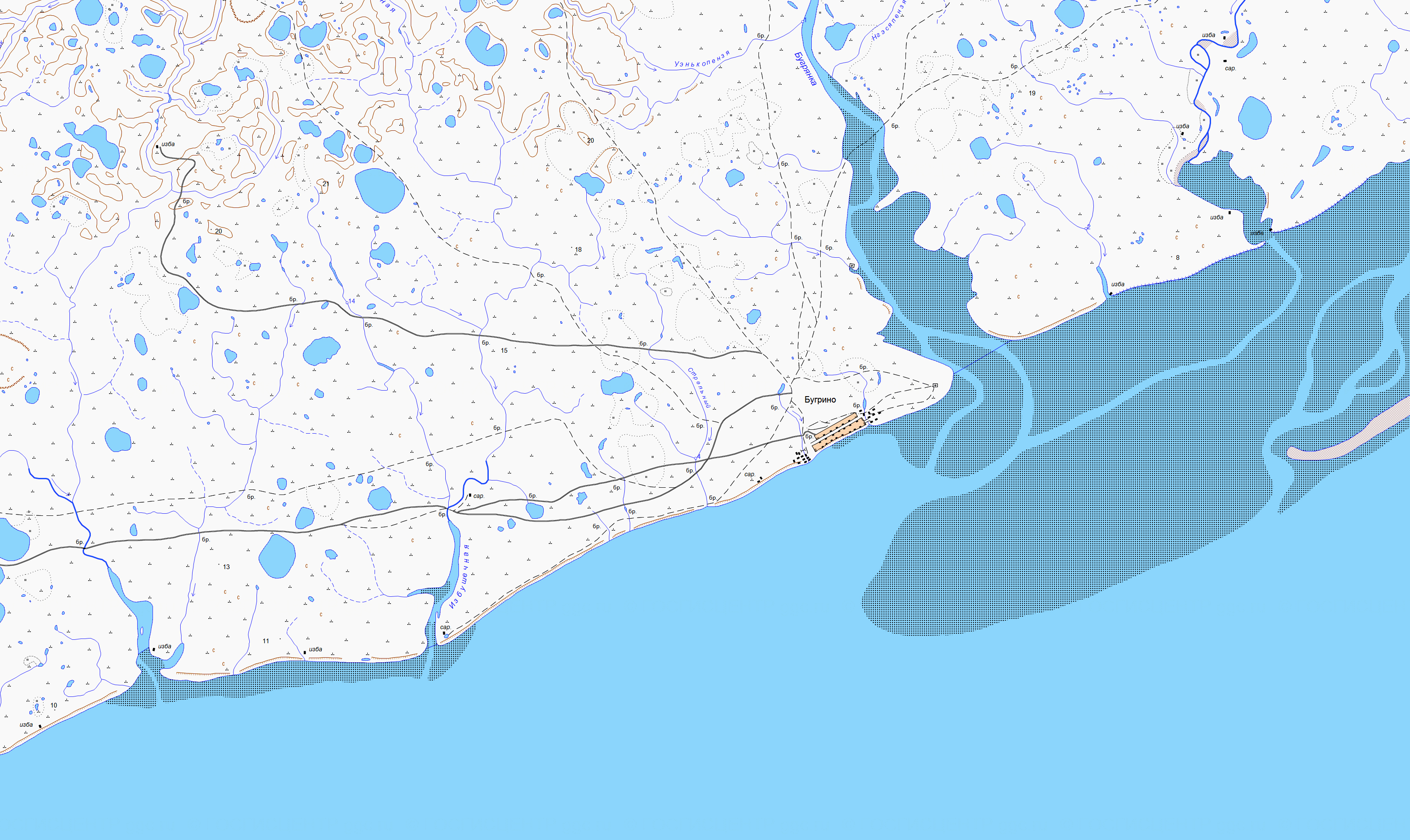 В 1925 году станция была расположена на северо-западной окраине становища Бугрино в 1 км к юго-западу от р.Бугрянки. Метеорологическая площадка находилась в 20 м от берега моря и в 6-8 м от построек. В октябре 1930 года станция перенесена на 0.5 км к северо-востоку в район больницы. Метеорологическая площадка находится на открытом ровном месте в 15 м от берегового обрыва высотой 5-8 м и в 45 м от дома станции. В 50 м к западу от площадки протекает ручей, летом пересыхающий. Постройки находятся на юго-западе в значительном удалении.