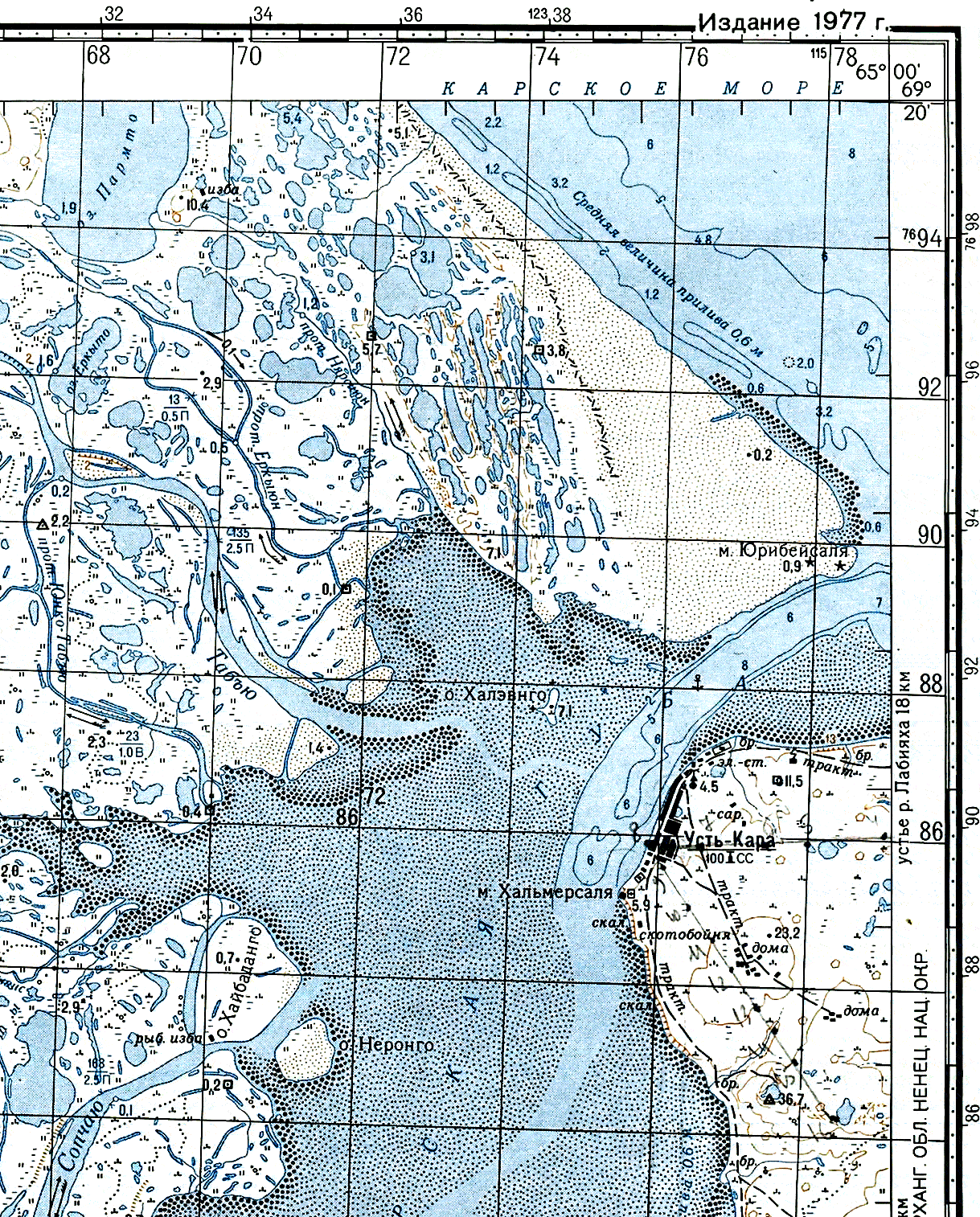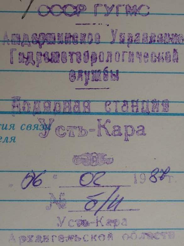 Начинаю вести дневник. Полярная станция Усть-Кара, координаты ее 69015/ с.ш., 64031/ в.д. Карское море, Байдарацкая губа, Карская губа. Судя по числу, уже март месяц – месяц весны, а судя по погоде на улице – суровая зима: метель со снегом, температура воздуха – 11,00, давление (на уровне моря) 1017.1 мб, влажность 92 (гигрометр), ветер ЮЗ, скорость 15,2 м/сек, max скорость 20 м/сек, max порыв 24 м/сек, облачность среднего яруса (10/0 As). К 20 часам метель утихла, но в ночь на 20.03. разыгралась вновь.