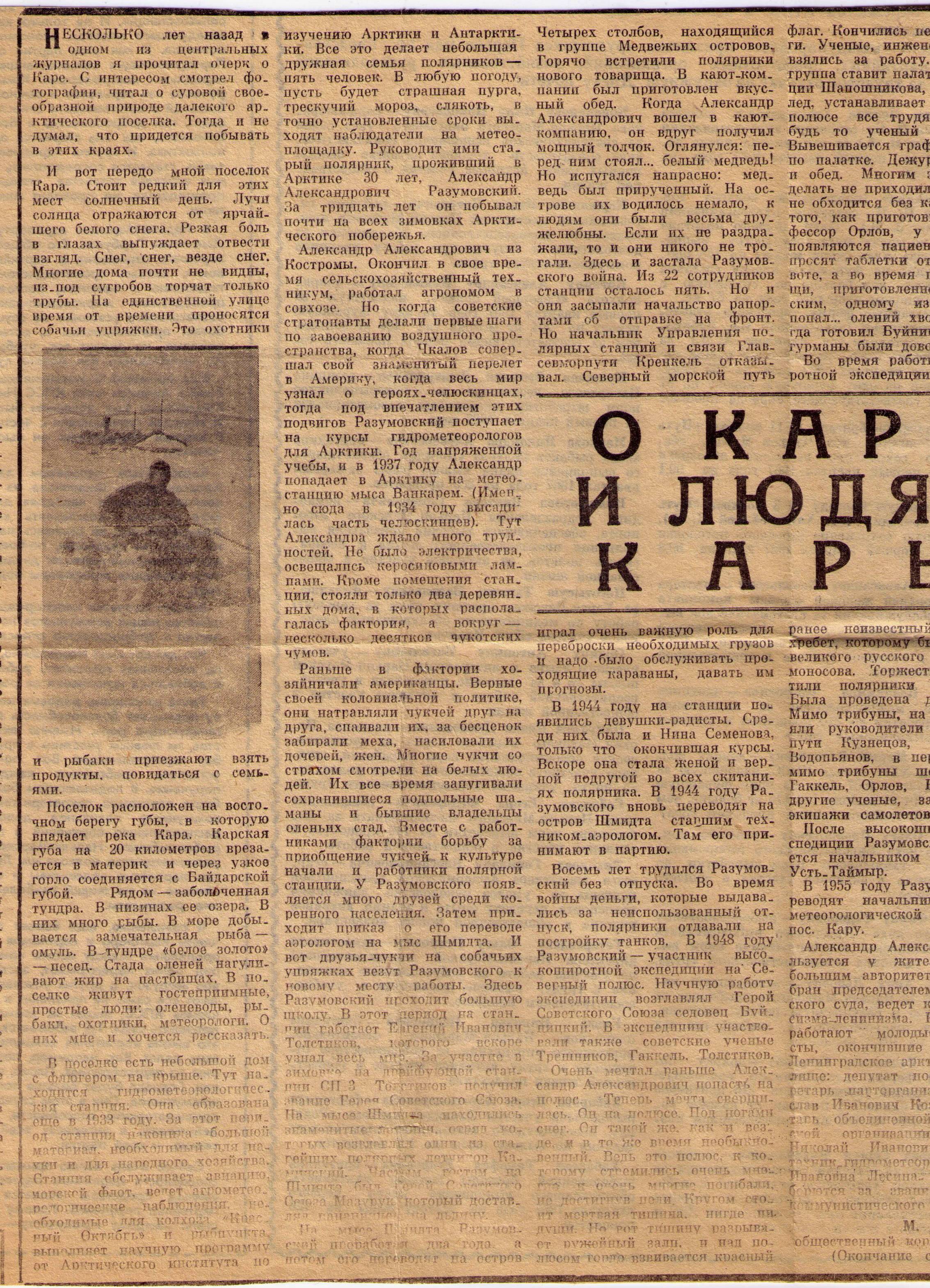 Мой отец Козлов Вячеслав Иванович, был некоторое время сотрудником, а затем и начальником метеостанции в п. Усть-Кара. Сейчас его уже нет в живых. но от него остались его дневники. Которые я переделал в книжку "Карские зарисовки".