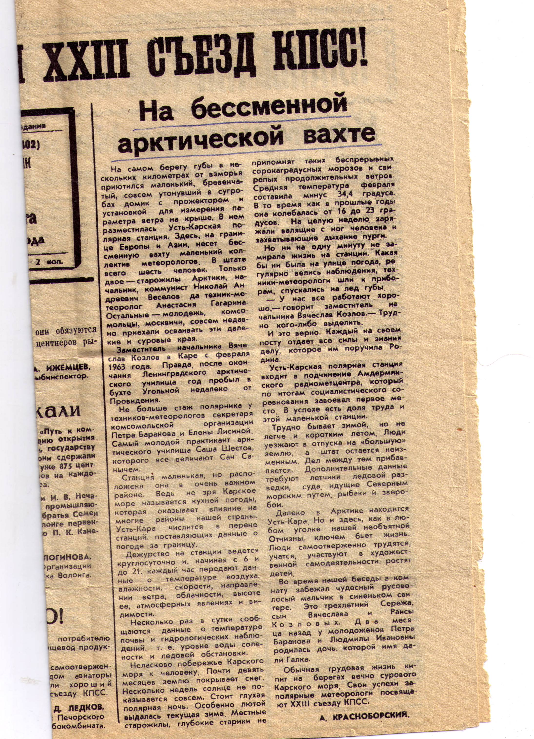 (Дополнение жены – Козловой Р.А.): В Усть-Кару приезжал 1 секретарь ОК КПСС - Швецов Иван Кузьмич, он предложил, моему мужу - Козлову В.И., переехать в Нарьян-Мар, для работы в ОК КПСС Ненецкого национального округа. Мы согласились.
