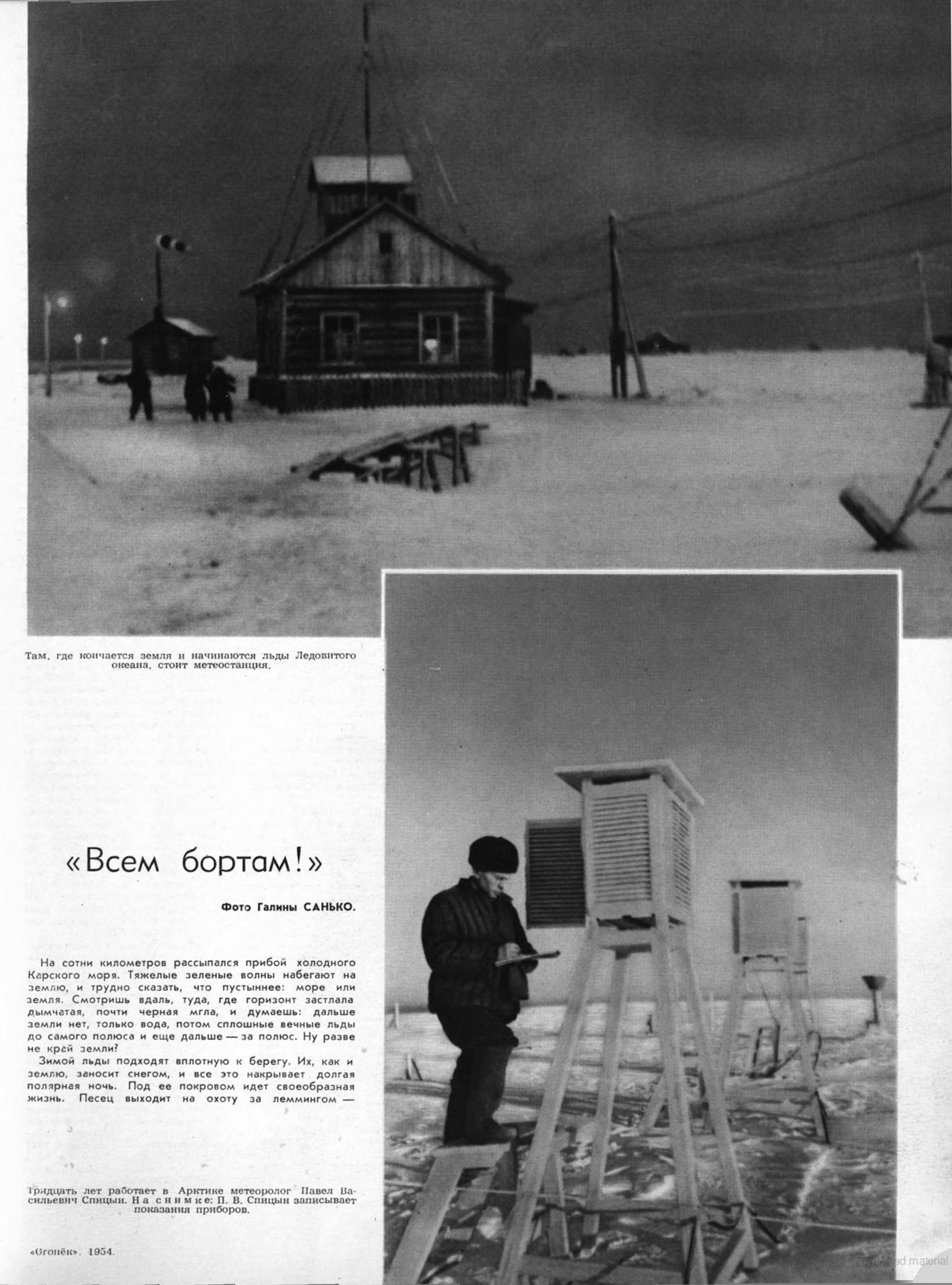 Сегодня закончил основную таблицу ТМ-1 за февраль и таблицу снега и метели ТМ-2а. Вся зима прошла сравнительно спокойно и сейчас, словно спохватившись, наверстает упущенное. Шуршит и воет за окном, наметает огромные сугробы. Видимость доходит до 10 метров. И тем не менее рабочий ритм поселка, порта и полярной станции не нарушается ни на минуту. Также как и в хорошую, тихую погоду, точно в срок, летят в эфир телеграммы с данными о погоде, уходят дети в школу и садятся за математику и литературу. Только авиатехники садятся за домино и книги, полетов нет – отдыхай, да охотники и рыболовы пережидают дома непогоду.