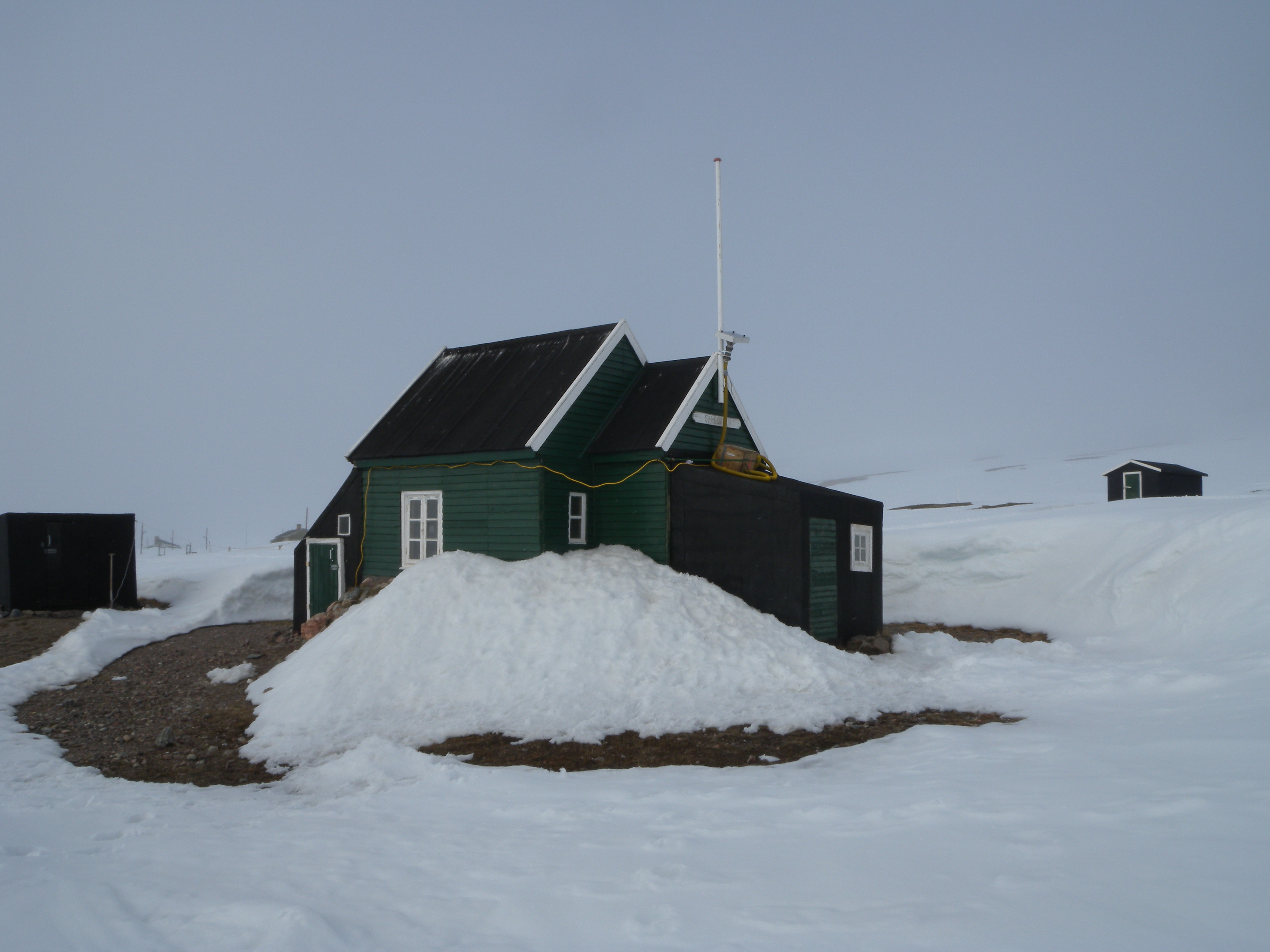 Рядом с исследовательской базой находится база датской погранзаставы (патруль на собачьих упряжках) "Сириус". Там же находится "почтовое отделение", откуда можно послать открытку с местным гашением, тем же штемпелем желающим ставится отметка в паспорте. На первом фото местный "Печкин" со своими "Шариками". :post: