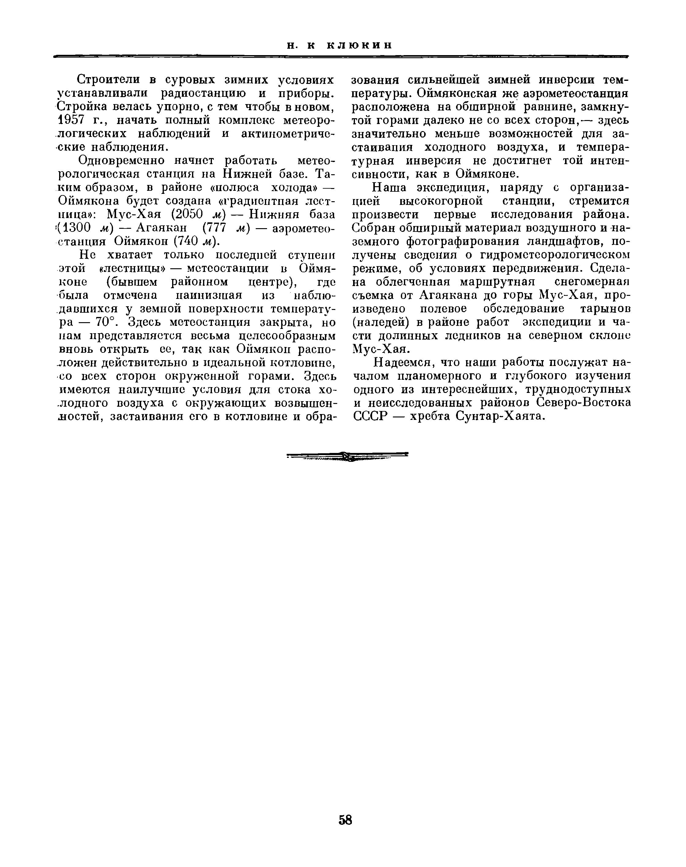 Для измерения температуры грунтов в высокогорье была пробурена 50-метровая скважина. Руководил работой буровой мастер М.Ф.Драгунский. Это оказалось нелегким делом - грунт был скальным. Геотермические измерения до глубины 45 метров велись также во впадине на станции вблизи поселка Оймякон (Томтор). Руководил всеми температурными измерениями Р.М.Сапожников.