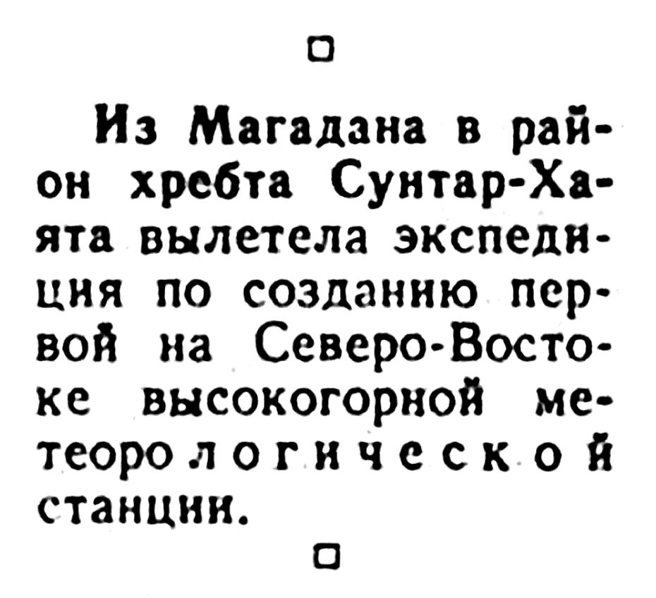 Наиболее сложной в техническом отношении была организация станции на хребте. В апреле 1957 года метеоролог Н.К.Клюкин (Магаданское управление гидрометеослужбы) прибыл из Оймякона на оленьих упряжках с грузом на выбранную площадку. Вскоре там была построена метеостанция и начаты наблюдения. Геокриологическую станцию решено было построить рядом с метеостанцией. Для заброски запасов продовольствия, бурового инструмента, снаряжения и оборудования, необходимых для жизни и работы персонала, было решено использовать небольшой самолет. Но первый же облет территории показал, что посадить самолет в районе намечаемой станции очень сложно, так как поверхность покрыта крупными валунами, щебенкой и кустарником.
