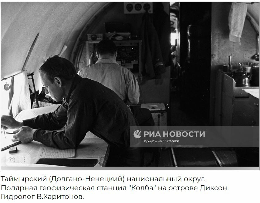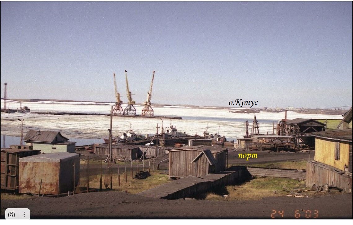 Провёл консультации с Наталией Георгиевной Новиковой и Валерием Савиным, который ещё живёт на Диксоне. Надписи на фотографии сделала Наталия Георгиевна . Слова Валерия: "Да, конечно, фото с берегового посёлка. Остров Конус правее от кранов. Там с островом Диксон сливается." Наталия Георгиевна ещё одну весёлую фотографию про Колбу прислала.