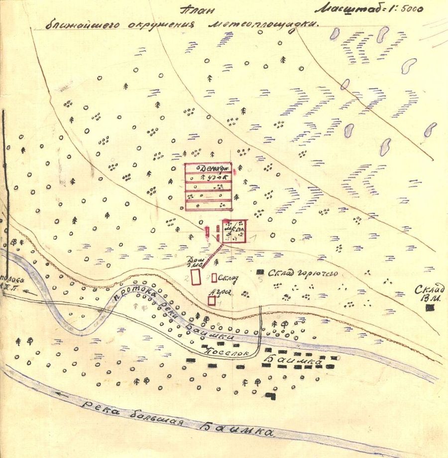31.07-03.08 Выбрано место метеоплощадки, выкопаны ямы для установки метеоприборов, под якоря флюгеров и для столбов ограды метеоплощадки. Поставлены столбы изгороди и приборов. Сделан деревянный помост-настил через заболоченную местность к метеоплощадке.