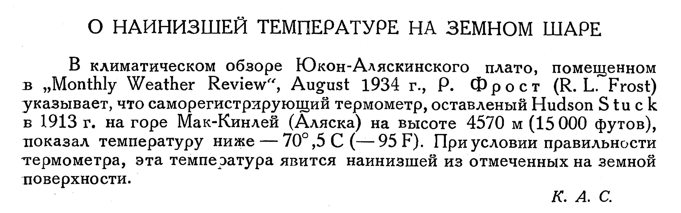 В 1926 г., во время работ Индигирской экспедиции Геологического комитета, было обнаружено, что температуры октября и ноября в Оймеконе (впадина, лежащая в верховьях Индигирки между 63° и 64°N) на 3°—7° ниже чем в Верхоянске, признанном полюсе холода. Это позволило мне высказать предположение, что полюс холода должен быть перенесен в Оймекон.