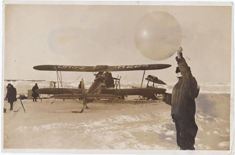 http://goskatalog.ru/portal/#/collections?id=8953598Вдалеке у борта "Таймыра" У-2 Н-224 Г.П.Власова и и Ш-2 М-32 И.И.Черевичного (виден двигатель). Февраль 1938 г.
