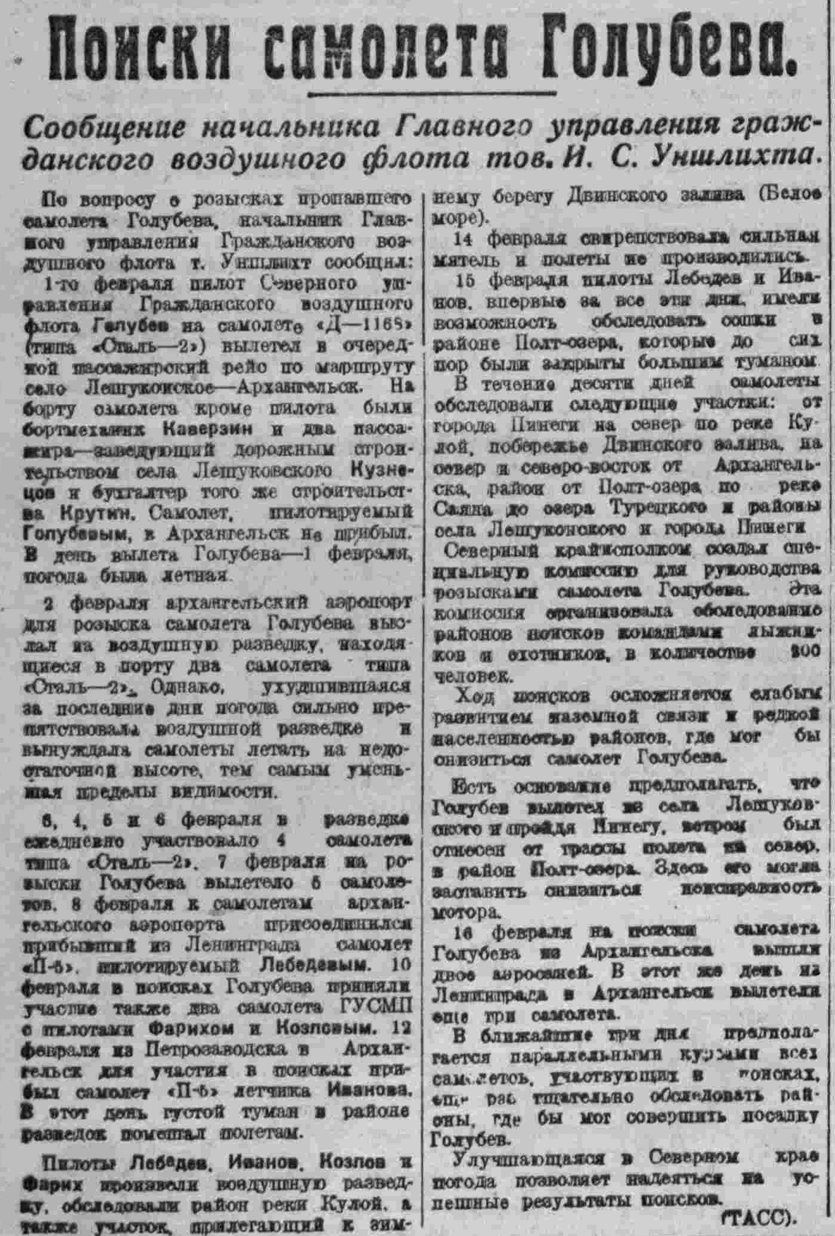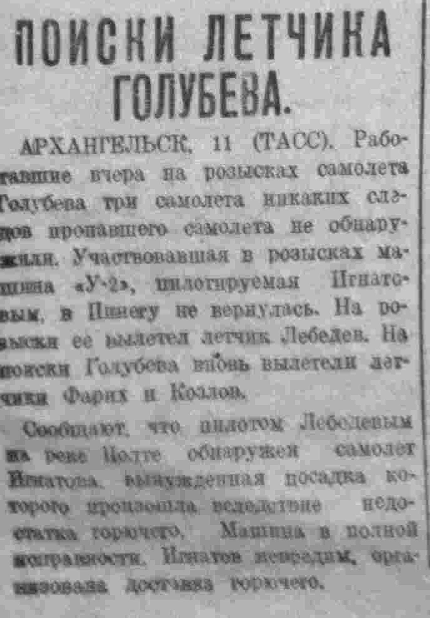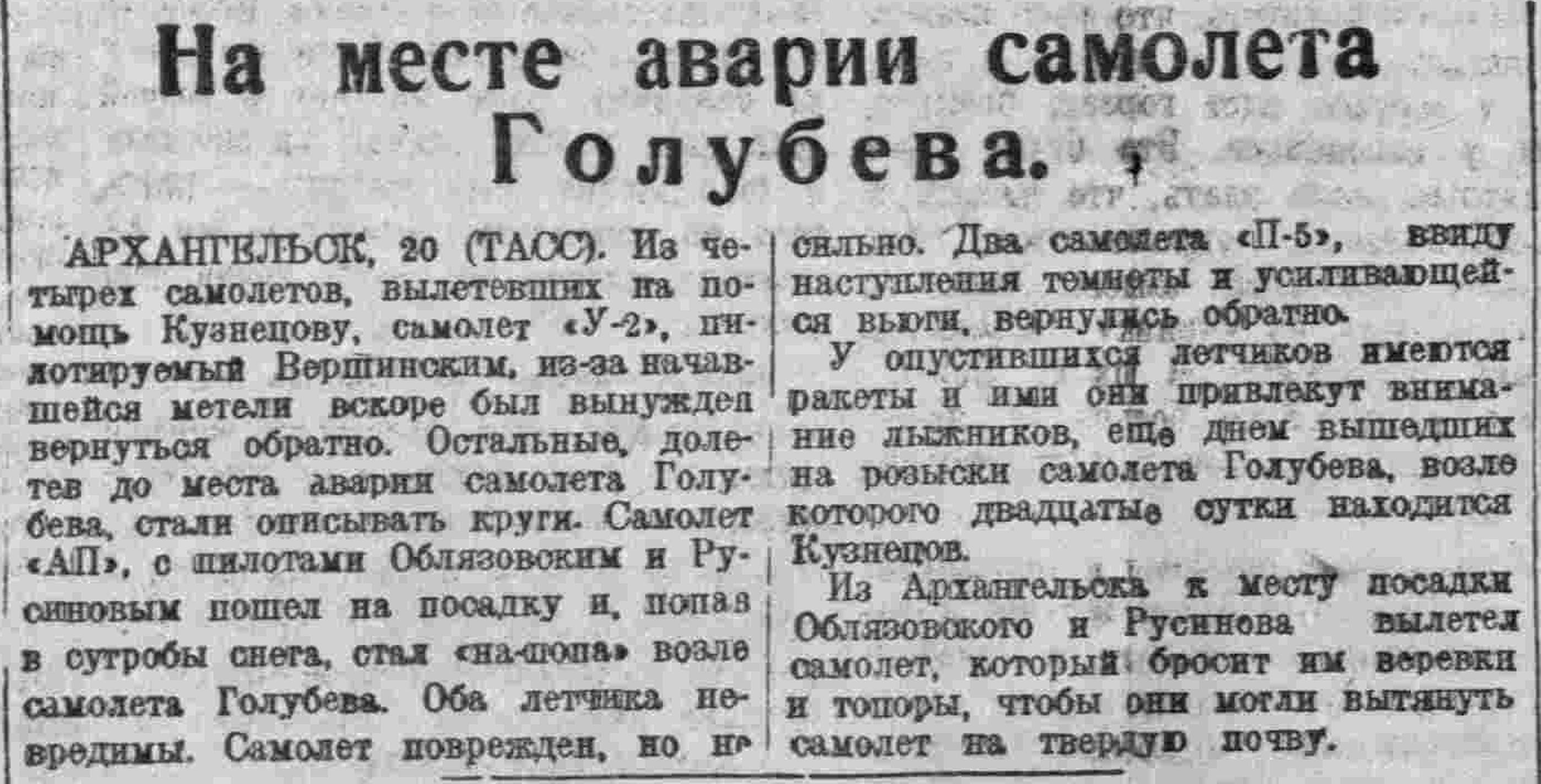 АРХАНГЕЛЬСК, 20 (ТАСС). Из четырех самолетов, вылетевших на помощь Кузнецову, самолет «У-2», пилотируемый Вершинским, из-за начавшейся метели вскоре был вынужден вернуться обратно. Остальные, долетев до места аварии самолета Голубева, стали описывать круги. Самолет «АП», с пилотами Облязовским и Русиновым пошел на посадку и, попав в сугробы снега, стал "на-попа" возле самолета Голубева. Оба летчика невредимы. Самолет поврежден, но не сильно. Два самолета "П-5", ввиду наступления темноты и усиливающейся вьюги, вернулись обратно.