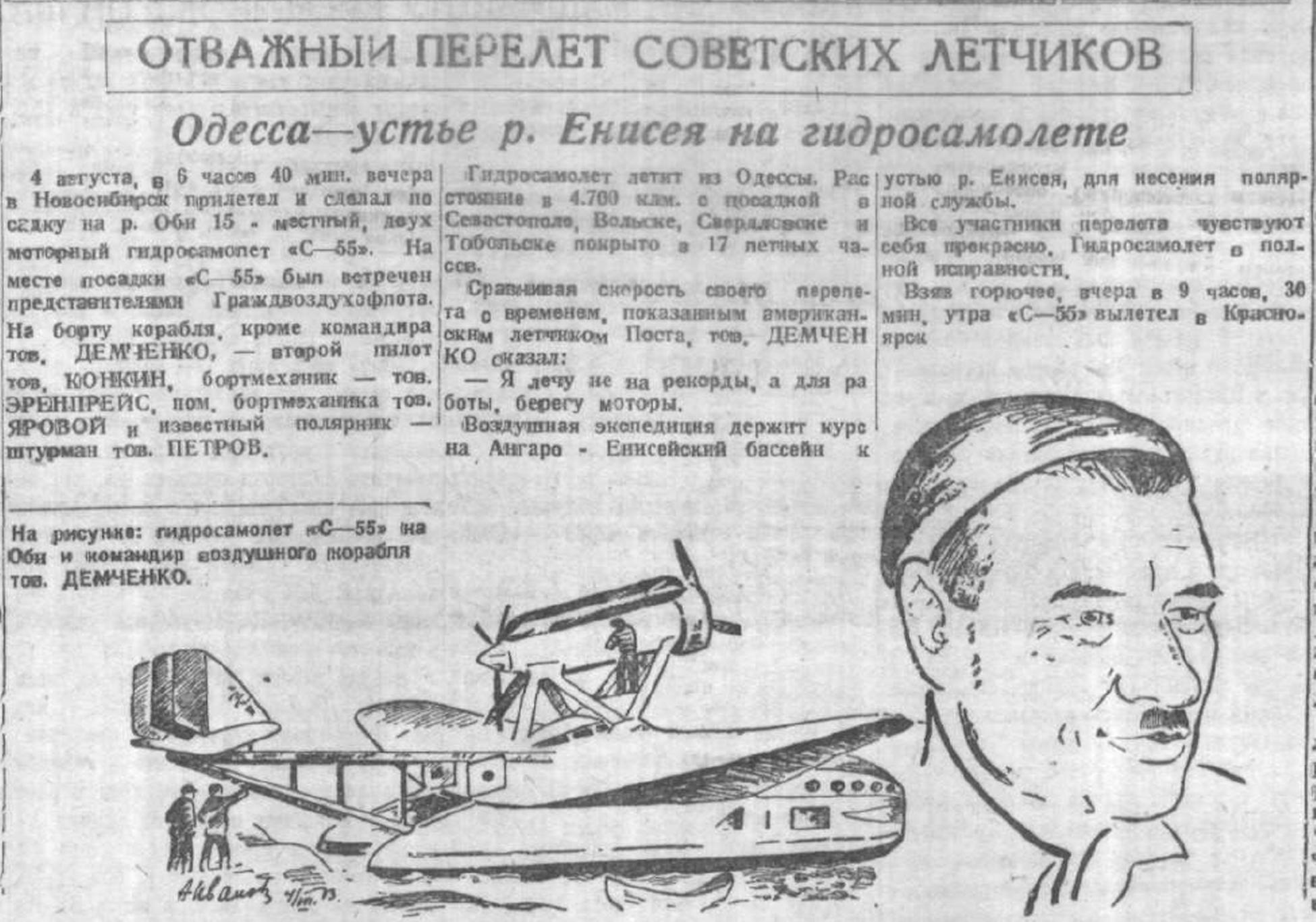 4 августа, в 6 часов 40 мин. вечера в Новосибирск прилетел и сделал посадку на р. Оби 15 - местный, двухмоторный гидросамолет «С—55». На месте посадки «С—55» был встречен представителями Граждвоздухофлота. На борту корабля, кроме командира тов. ДЕМЧЕНКО, — второй пилот тов, КОНКИН, бортмеханик — тов. ЭРЕНПРЕЙС, пом. бортмеханика тов. ЯРОВОЙ и известный полярник — штурман тов. ПЕТРОВ.