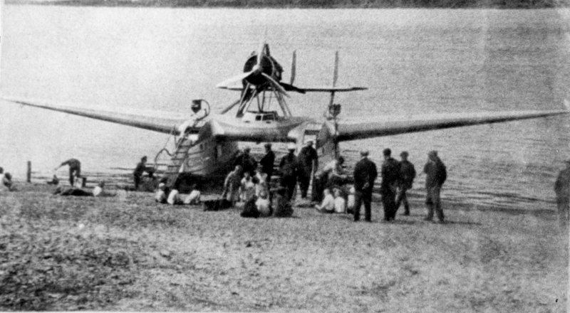 В 12 часов 10 мин. 27 сентября на горизонте со стороны Советской гавани в воздухе появилась летящая точка. Она быстро приближалась и через несколько минут приняла очертание стрекозы. Блестящая в солнечных лучах, оглушающая город рокотом мотора, стрекоза оказалась мощным красавцем гидросамолетом "Савойя 55". Описав в воздухе два круга, "С 55" уверенно пошел на посадку и, взметая вокруг себя пыль морских брызг, закончил свой ныряющий бег по волнам возле устья речки Александровки.