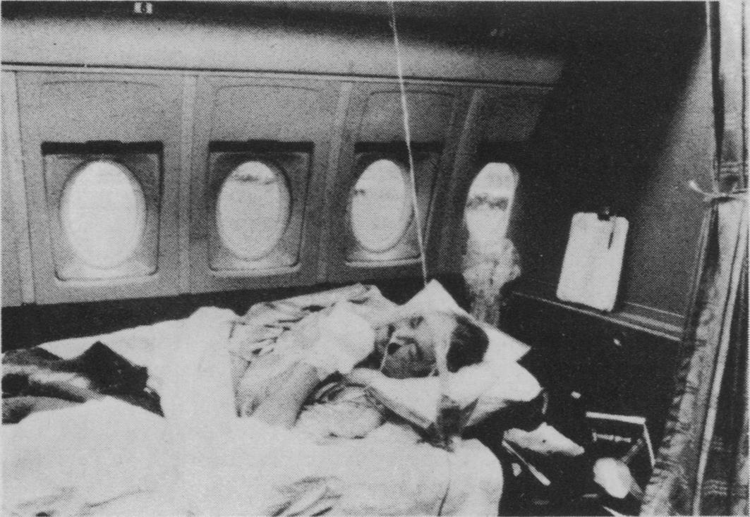 Раненый бортрадист Гариф Шамильевич Узикаев на специально оборудованом месте в салоне Ил-62.