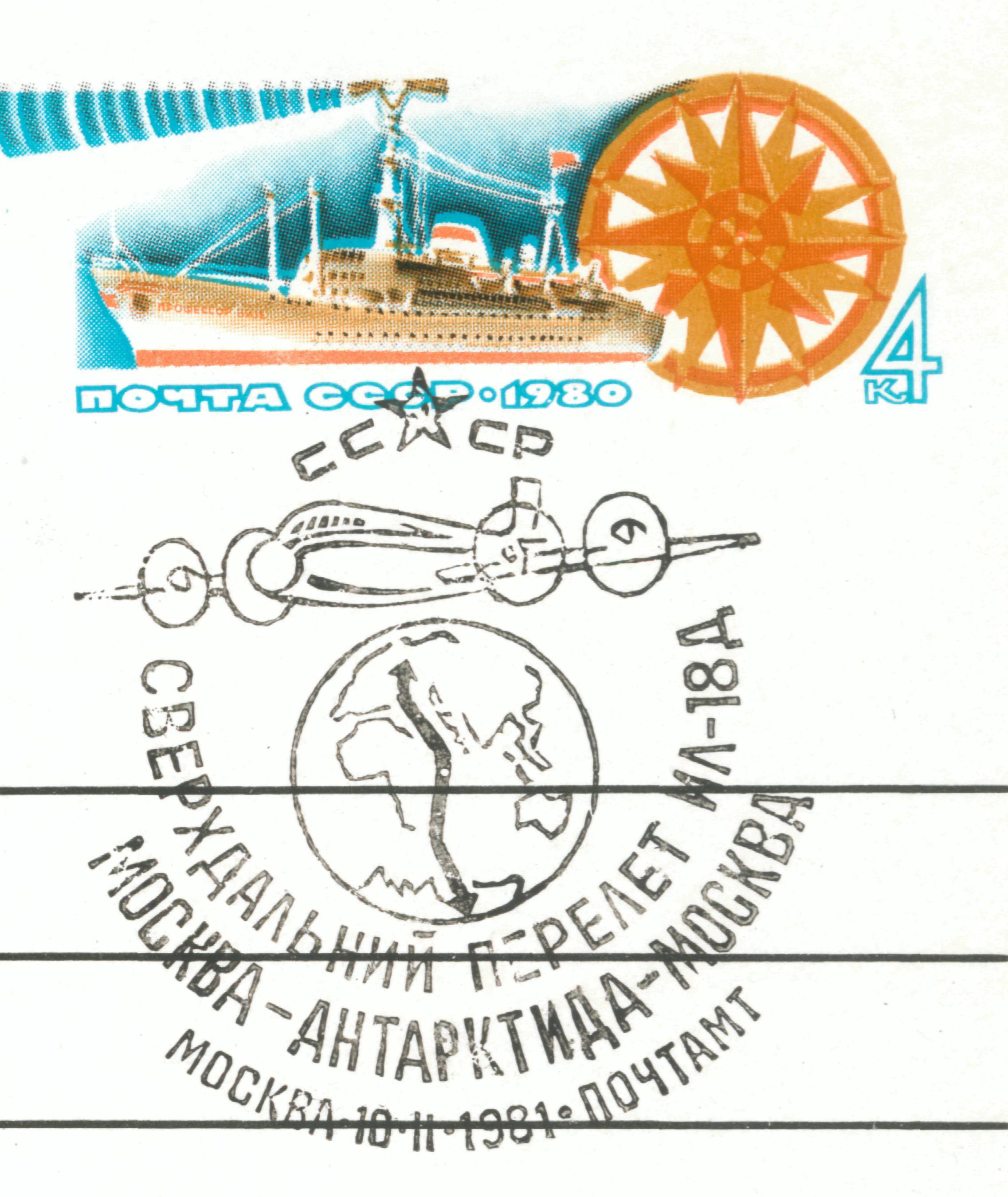 Первый перелёт по маршруту Москва-Антарктида-Москва был совершён в 1963 году. Карточка с оригинальной маркой посвящена такому перелёту в 1980 году. В 1980 году были завершены работы по вводу в эксплуатацию уникальной снежно-ледовой ВПП в 12,3 км восточнее станции «Молодежная» в районе горы Вечерняя, способной принимать тяжелые самолеты типа Ил-18 на колесном шасси, и в феврале 1980 года Ил-18Д (СССР-74267) совершил перелет в Антарктиду и первую посадку на новой ВПП. Командиры экипажей – А.Н. Денисов и Е.П. Бунчин. Руководитель перелета Б.Д. Грубий. 16 февраля 1980 года этот самолет совершил беспосадочный полет по маршруту «Молодежная» - Полюс Недоступности – Южный географический полюс – «Молодежная», во время которого была выполнена короткая научная программа по геофизике и метеорологии. Вернулась в Москву машина 23 февраля 1980 года, преодолев за всю экспедицию в общей сложности 45 660 км. Летное время составило 78 часов 54 минуты. Эти перелеты положили начало регулярным полетам самолетов из СССР в Антарктиду, которые продолжались до 1992 года.