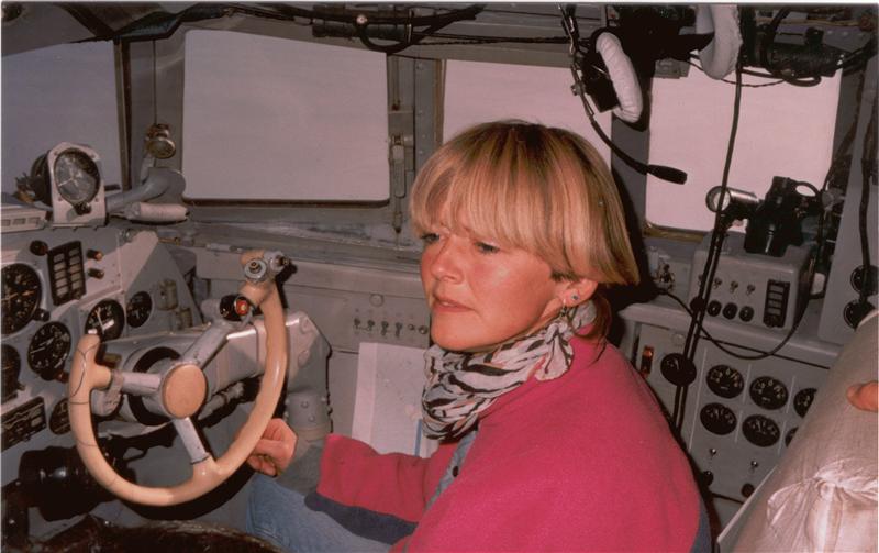 "Вот еще фото кабины 74267. Шпицберген. За штурвалом совладелица нефтянной компании Норвегии, на которую мы работали. Звали ее Райдун. Очень простая и порядочная женщина как хозяйка. Нашим бы быть такими…»