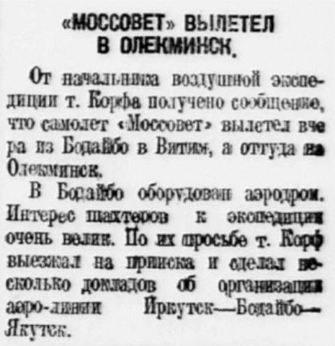 От начальника воздушной экспедиции т. Корфа получено сообщение, что самолет "Моссовет" вылетел вчера из Бодайбо в Витим, а оттуда на Олекминск. В Бодайбо оборудован аэродром. Интерес шахтеров к экспедиции очень велик. По их просьбе т. Корф выезжал на прииска и сделал нисколько докладов об организации аэро-линии Иркутск — Бодайбо — Якутск.
