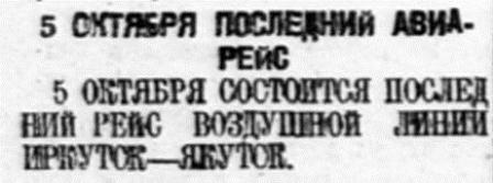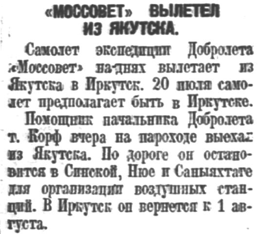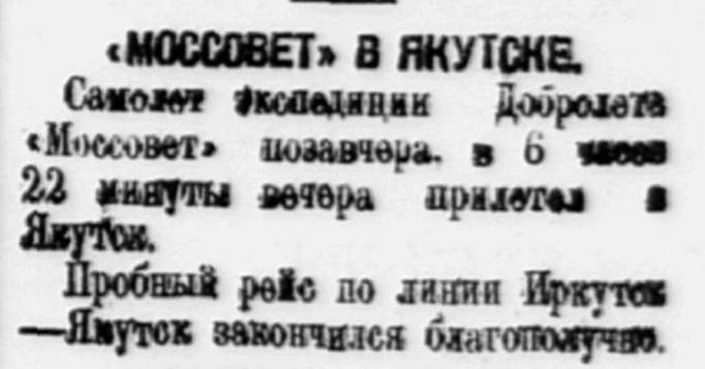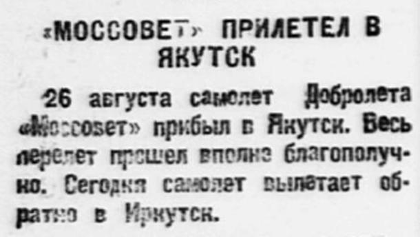 26 августа самолет Добролета "Моссовет" прибыл в Якутск. Весь перепет прошел вполне благополучно. Сегодня самолет вылетает обратно в Иркутск.