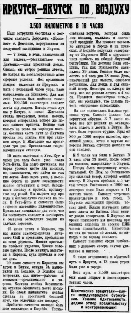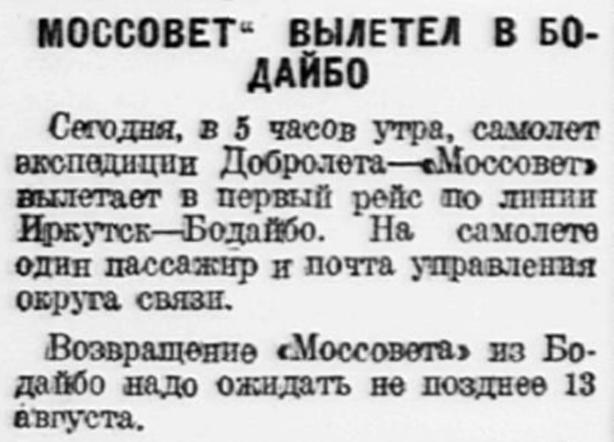 Вчера, в три часа ночи, самолет экспедиция Добролета — «Моссовет», по просьбе якутского ЦИКа, вылетел в Якутск для участия в празднествах по случаю юбилея республики.