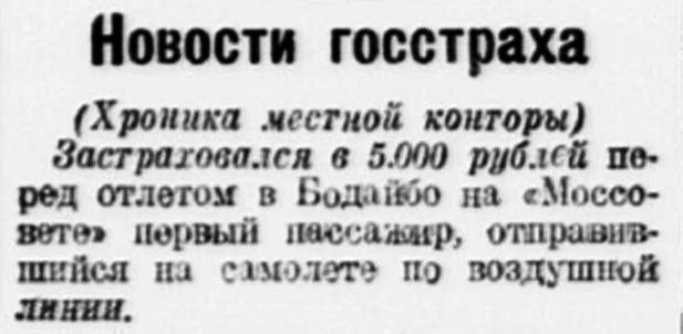 Застраховался в 5.000 рублей перед отлетом в Бодайбо на «Моссовете» первый пассажир, отправившийся на самолете по воздушной линии.