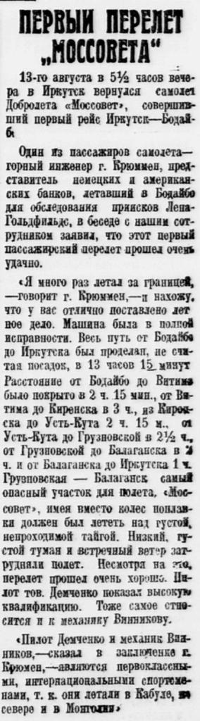 13-го августа в 5 1/2 часов вечера в Иркутск вернулся самолет Добролета «Моссовет», совершавший первый рейс Иркутск — Бодайбо.