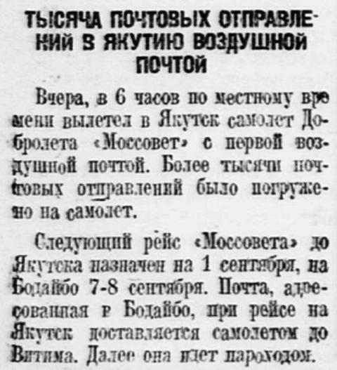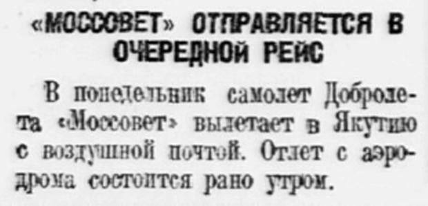 Вчера, в 6 часов по местному времени вылетел в Якутск самолет Добролета «Моссовет» с первой воздушной почтой. Более тысячи почтовых отравлений было погружено на самолет.