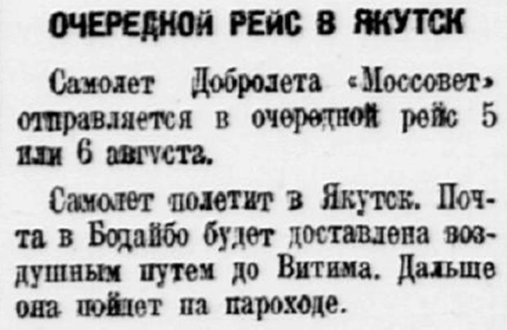 Следующий рейс «Моссовета» до Якутска назначен на 1 сентября, на Бодайбо 7-8 сентября. Почта, адресованная в Бодайбо, при рейсе на Якутск доставляется самолетом до Витима. Далее она идет пароходом.