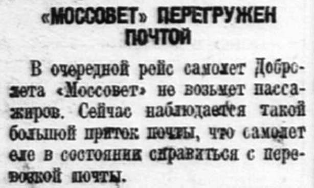 В очередной рейс самолет Добролета «Моссовет» не возьмет пассажиров. Сейчас наблюдается такой большой приток почты, что самолет еле в состоянии справиться с перевозкой почты.